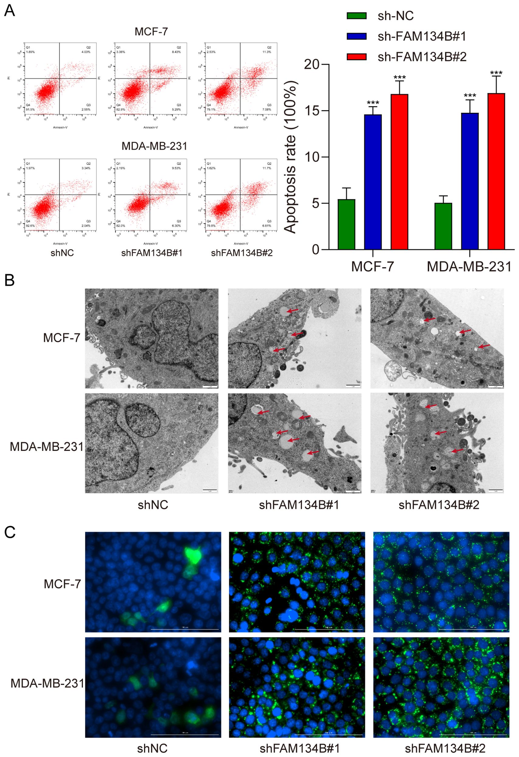 Subsequently, we examined the apoptosis rate of breast cancer cells post transfection by flow cytometry assay. The results indicated a significant increase in the apoptosis rate of breast cancer cells following silence of FAM134B (P<0.001, Figure 3A). Transmission electron microscopy revealed an increase in the number and size of autophagosomes in shFAM134B-transfected cells compared to shNC-transfected cells (Figure 3B). Furthermore, the experimental findings from immunofluorescence demonstrated a higher content of LC3 protein in the shFAM134B group compared to the control group (Figure 3C). These results suggest that downregulation of FAM134B induced apoptosis and autophagy in breast cancer cells.