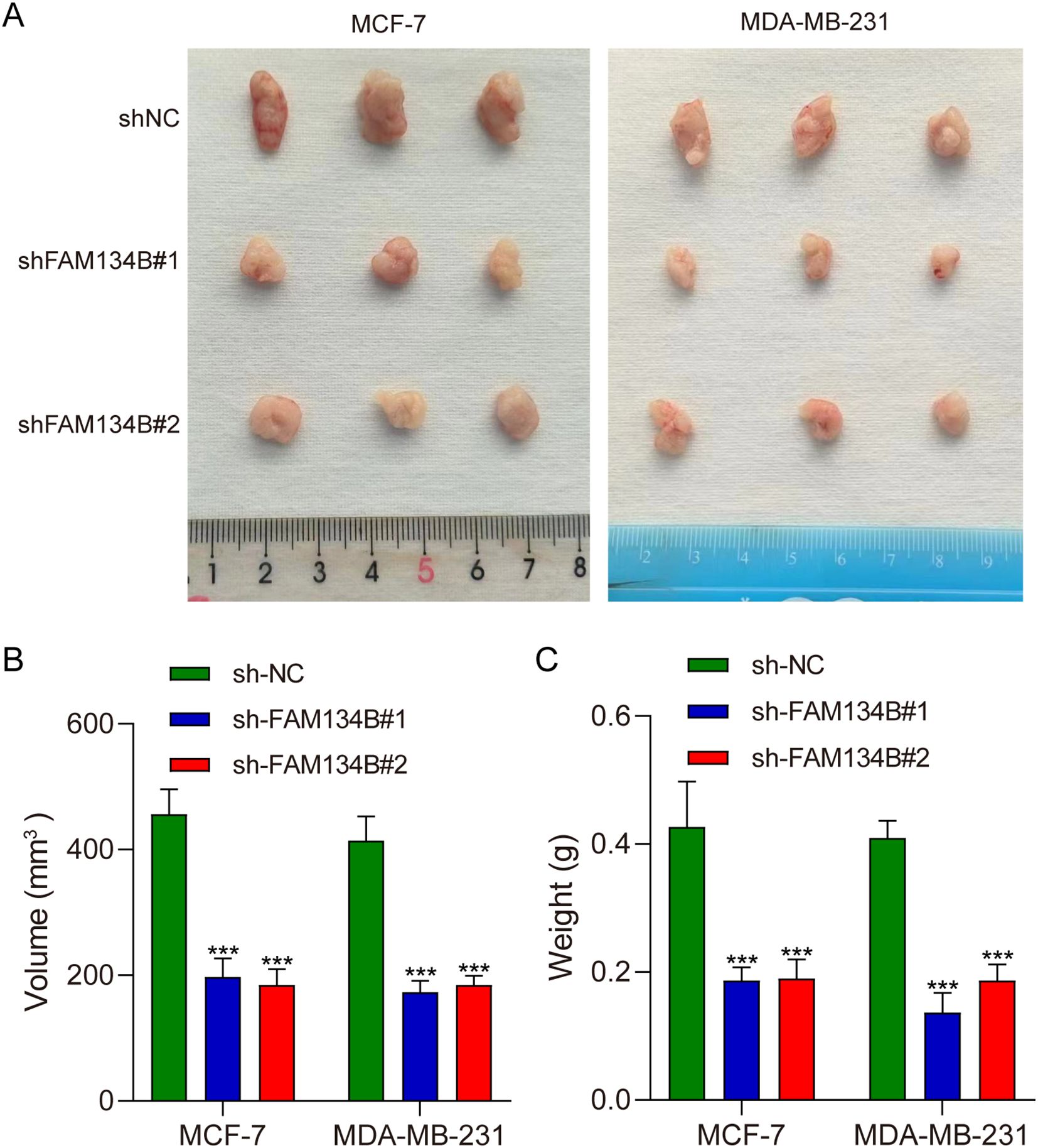 Figure 5. FAM134B knockdown inhibited the progression of breast cancer in vivo. (A) Representative images of tumors from nude mice injected with shFAM134B- or shNC-transfected MCF-7 and MDA-MB-231 cells (21 days post-injection). (B) The volume of the tumors. (C) The weight of the tumors. ***P<0.001 compared with shNC group.