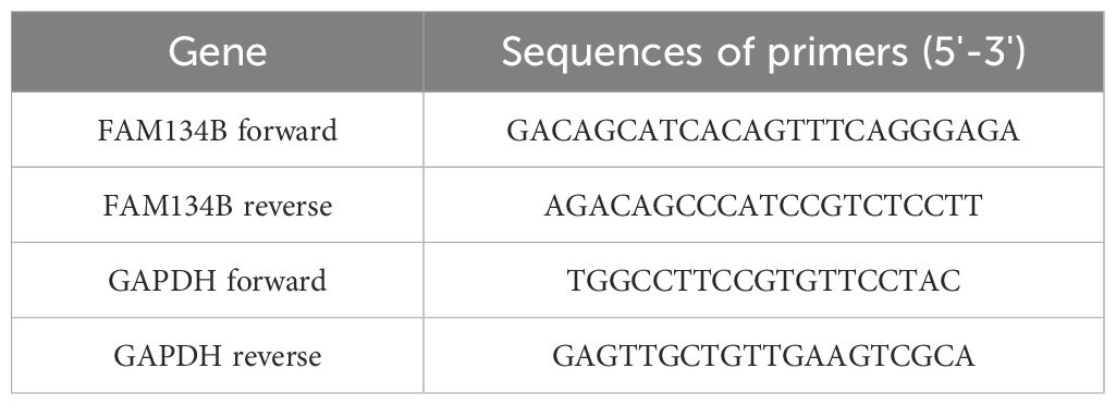 For qRT-PCR, total RNA was extracted from cells with TRIzol reagent (Invitrogen, USA) according to the manufacturer’s protocol. Complementary DNA (cDNA) was synthesized from RNA with Reverse Transcription Kit (Takara, Japan). Then qRT-PCR assay was performed by SYBR® Premix Ex TaqTM (Takara) according to the instruction. The GAPDH was used as an endogenous control gene for normalizing the expression of FAM134B. The primer sequences are shown in Table 1.