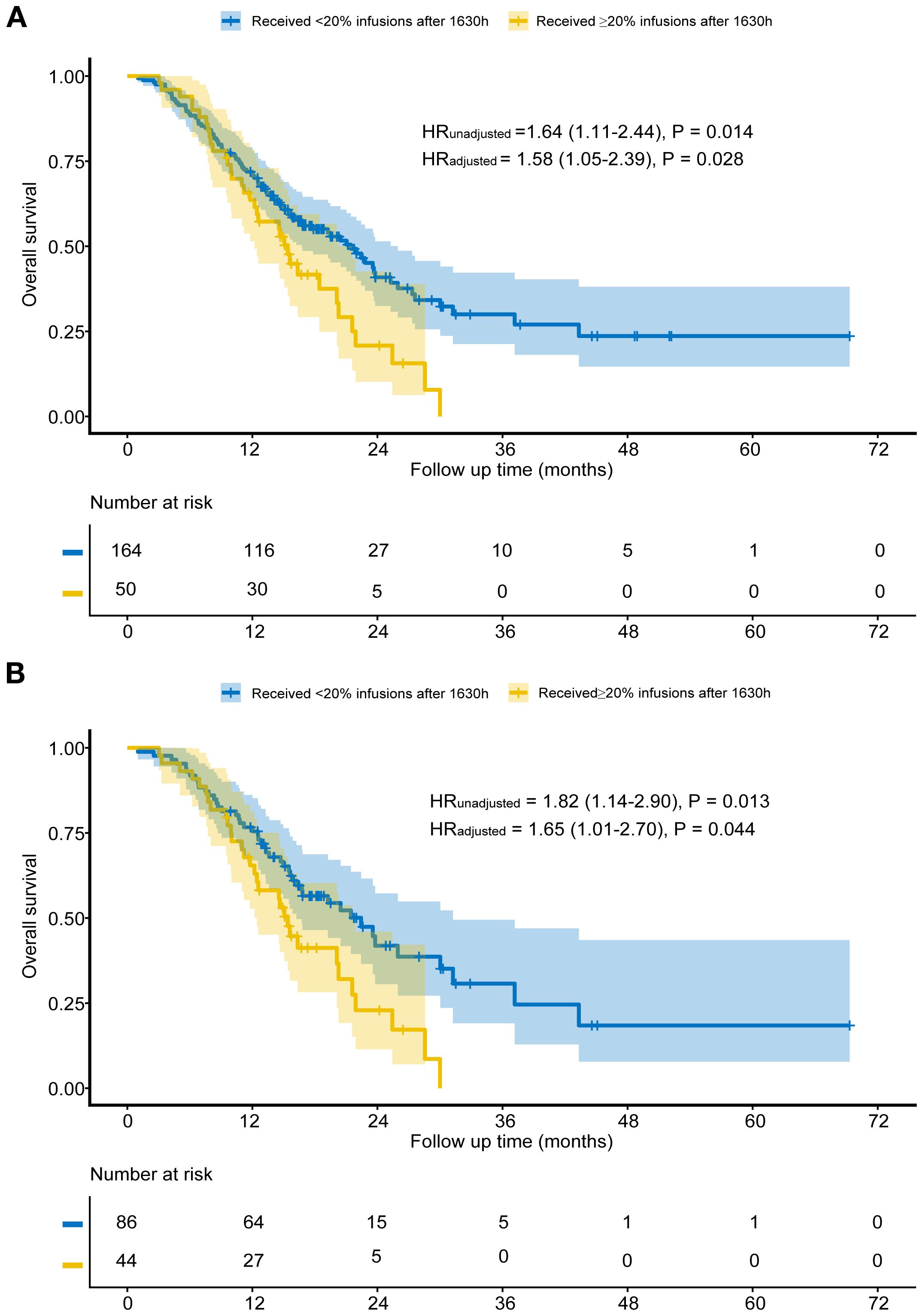 Results: Among 214 patients, 50 patients received ≥20% of ICI after 1630h (Group A), while 164 patients received <20% (Group B). Before propensity score matching, patients in Group B exhibited significantly shorter OS compared to those in Group A (median 15.4 vs. 21.4 months, HR = 1.64, P = 0.014). After matching, the Group B (44 patients) continued to demonstrate significantly shorter OS than Group A (86 patients) (median 15.4 vs. 22.4 months, HR = 1.82, P = 0.013). Multivariable analysis confirmed these findings. No significant differences were found in PFS, ORR, or AEs (all P>0.050). Sensitivity analysis further validated the robustness of the results.