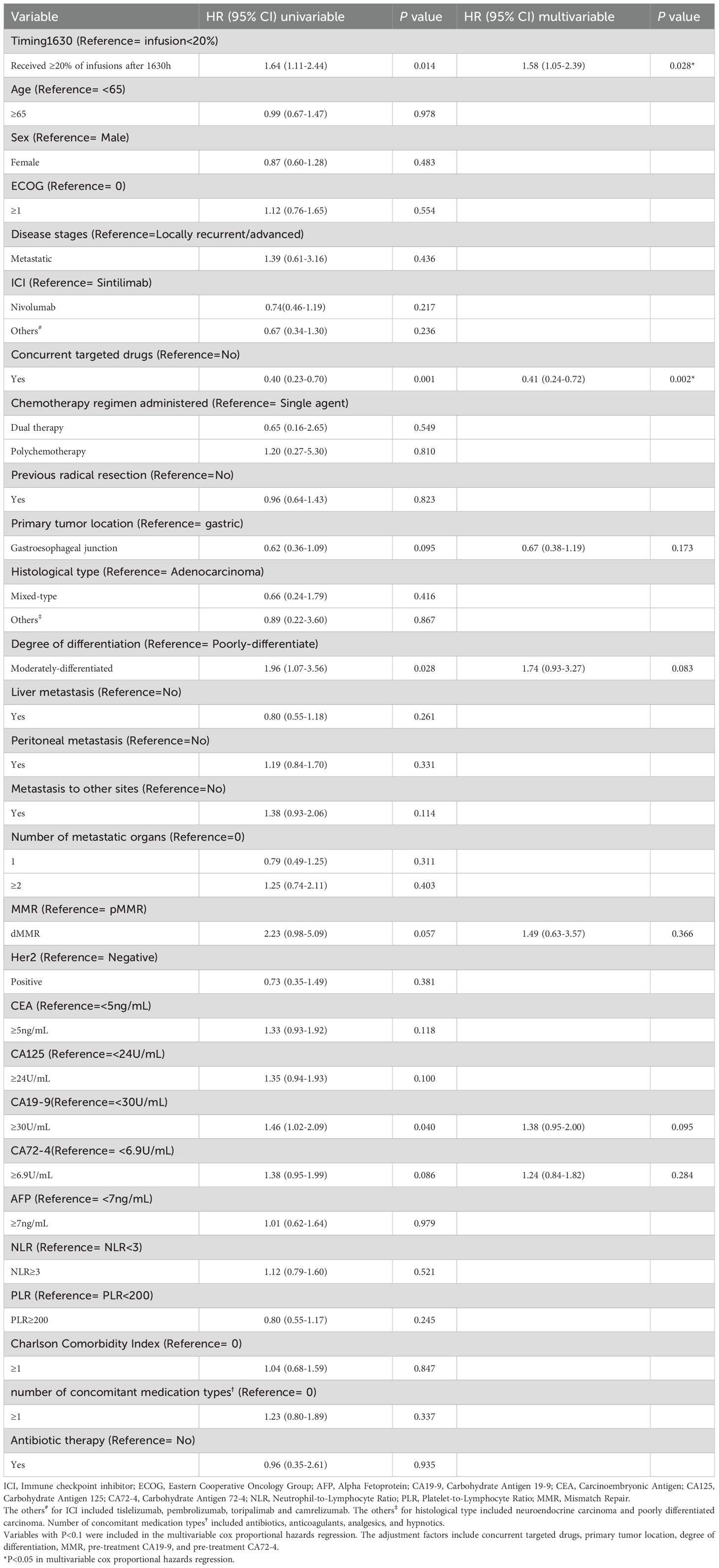 Two previous retrospective studies investigating nivolumab as a later-line treatment for GC both showed superior survival outcomes for patients receiving morning infusions (28, 29). Following the publication of the CheckMate649 trial, the era of first-line chemotherapy combined with immunotherapy became the standard of care for advanced GC (37). This regimen has improved mOS to approximately 15 months, compared to about 10 months with chemotherapy alone. Subsequent trials, including ORIENT-16, RATIONALE-305, and GEMSTONE-303, have further established the efficacy of Sintilimab, Tislelizumab, and Sugemalimab in first-line setting (30, 38, 39). Given the prevalent use of sintilimab in our clinical practice and study cohort, we performed a subgroup analysis focusing on patients receiving sintilimab plus chemotherapy. In the unmatched sintilimab subgroup, a significant association between infusion timing and OS was observed, which persisted after multivariable adjustment. However, in the propensity score-matched sintilimab subgroup, univariate analysis indicated only a borderline significant association (HR:1.53, 95% CI: 0.94-2.49, P = 0.088), which lost statistical significance after multivariable adjustment (HR:1.50, 95% CI: 0.92-2.45, P = 0.101).This discrepancy may be attributed to several factors: First, while propensity score matching balanced known prognostic variables, there may be unmeasured confounding variables, unmeasured confounders including tumor microenvironment heterogeneity, genomic profiles, or lifestyle differences may persist. The influence of such residual confounding can be magnified in subgroup analyses, potentially obscuring a true treatment effect. Second, the reduced sample size post-matching limited statistical power, increasing the risk of a Type II error. Notably, the hazard ratios from both univariate and multivariate analyses consistently ranged between 1.50 and 1.53, suggesting a stable, albeit not statistically significant, effect size. Although the P-values slightly exceeded the conventional threshold, this consistent trend may still hold clinical relevance, particularly in light of established circadian regulation of immune function.