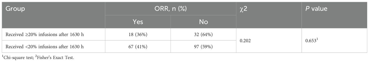 Our study has several limitations. First, although we observed a significant benefit in OS, no between-group differences were observed in PFS or ORR. This discrepancy may be explained by several factors. Patients in the control group might have received subsequent immunotherapy or other effective treatments after disease progression. Such crossover could mitigate between-group differences in PFS while concurrently improving long-term survival in the control group. Additionally, pseudoprogression or delayed clinical responses may not be accurately captured by conventional RECIST criteria, thereby influencing PFS and ORR assessments. The relatively limited sample size, coupled with closely matched median PFS between groups, may also have reduced the statistical power to detect a significant difference in PFS. Second, thresholds for defining early and late ICI infusion vary across previous studies, with cutoff times ranging from 1137h to 1630h and infusion proportion thresholds from 20% to 75% (27, 33). The 1630h cut-off adopted in our primary analysis is the most commonly applied, potentially due to its alignment with findings from earlier vaccination studies. To better identify optimal daily infusion timing, Catozzi et al. proposed a circadian mortality risk model; however, this model was derived from a heterogeneous cohort encompassing multiple cancer types and treatment lines (26). While our sensitivity analyses investigated various infusion cut-offs, they were insufficient to pinpoint a single optimal administration time. This highlights the need for future research specifically designed to identify the most therapeutic time window. Previous studies often determined assessment timing based on initial imaging or overall patient condition and typically excluded patients receiving fewer than four ICI doses (47, 48). In our study, considering standard efficacy assessment practices in China and the generally good performance status (ECOG score ≤1) of enrolled patients, we included all patients who received at least two infusions. The persistence of therapeutic antibody effects over weeks suggests that circadian regulation during the initial ICI cycles may be clinically more impactful than in later cycles. Thus, our study design is particularly relevant for evaluating the effect of infusion timing during the early phase of immunotherapy. Including patients with fewer infusion cycles also improves the real-world applicability of our findings, as early treatment discontinuation due to toxicity or progression is common in clinical practice. We nevertheless acknowledge that this approach introduces limitations, including relatively limited treatment exposure and potential heterogeneity in immune responses, which may affect the robustness of the results.