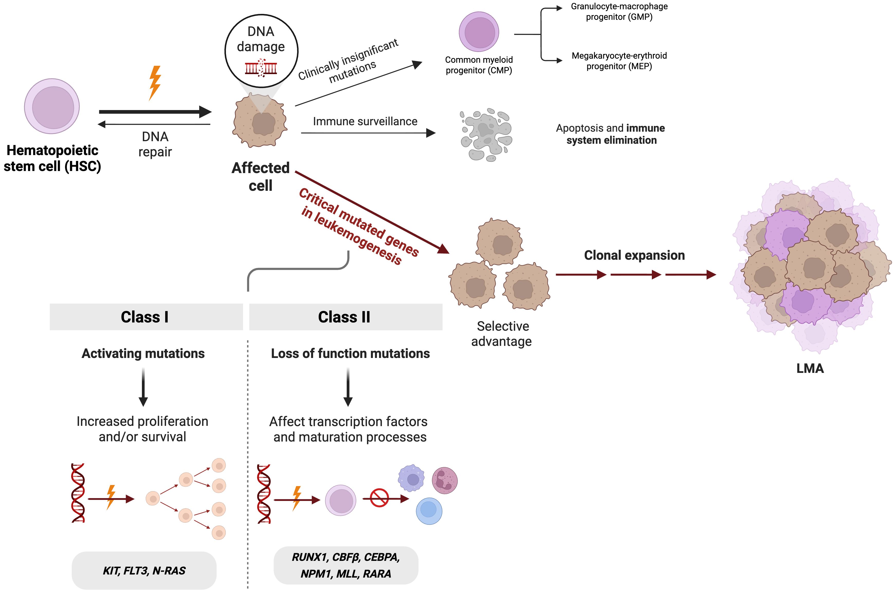 Figure 1. Key genetic alterations involved in leukemogenesis of acute myeloid leukemia (AML). Mutations in hematopoietic stem cells can disrupt some regulatory pathways, conferring a selective advantage that drives clonal expansion. In AML, Class I mutations (KIT, FLT3, N-RAS) increasing proliferation and survival of the tumor cells and Class II mutations (RUNX1, CBFβ, CEBPA, NPM1, MLL, RARA) impairing differentiation. Figure created with BioRender.com.