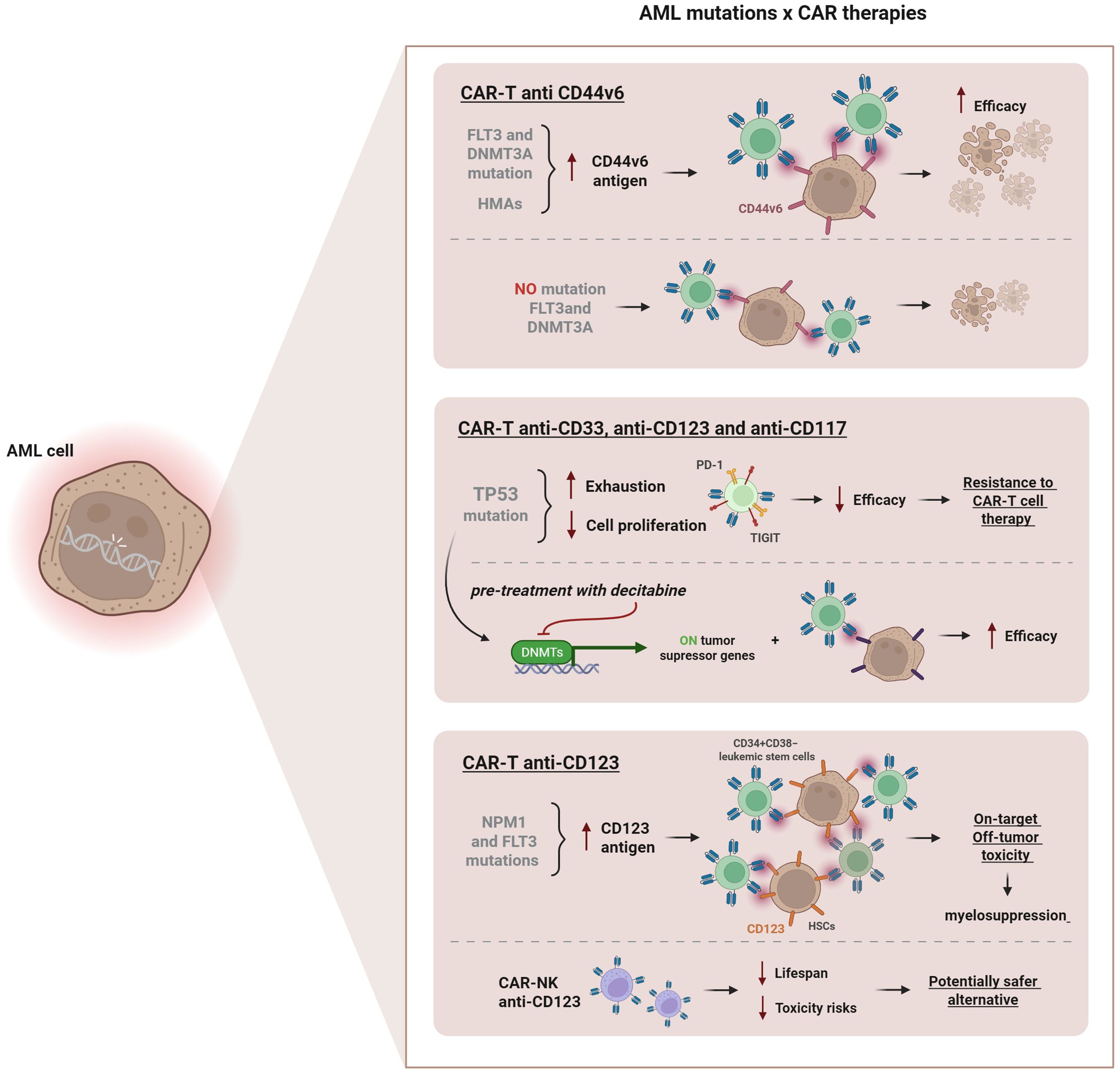 Figure 3. Influence of AML-associated mutations on CAR therapies. Mutations in FLT3 and DNMT3A increase CD44v6 antigen expression, enhancing CAR-T efficacy. Pre-treatment with hypomethylating agents (HMAs), such as decitabine or azacitidine further upregulates CD44v6 levels, improving anti-leukemic activity. TP53 mutations promote T cell exhaustion and upregulate inhibitory receptors (PD-1, TIGIT), reducing therapeutic efficacy. Pre-treatment with decitabine can restore tumor suppressor gene activity, improving CAR-T anti-CD33, anti-CD123 and anti-CD117 function. NPM1 and FLT3 mutations increase CD123 expression, but targeting the CD123 CAR-T can cause on-target/off-tumor toxicity and myelosuppression due to antigen expression on hematopoietic stem cells. CAR-NK anti-CD123 cells represent a safer alternative, reducing lifespan and toxicity risks.