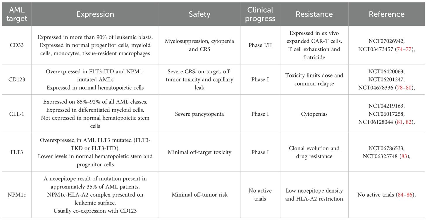 Among hematologic malignancies, acute myeloid leukemia (AML) remains a particularly challenging disease due to its high relapse rates and poor long-term survival outcomes. AML is characterized by significant genetic and antigenic heterogeneity, making the identification of universal CAR targets challenging (41–43). Furthermore, many potential AML-associated antigens, such as CD33 and CD123, are also expressed on healthy hematopoietic stem and progenitor cells, increasing the risk of on-target, off-tumor toxicity (44). Despite these challenges, ongoing research into CAR therapies for AML has identified promising targets, including CD33 (45), CD123 (46), and CLL-1 (47), among others (48–62). Additionally, mutations such as FLT3-ITD, NPM1, and DNMT3A not only contribute to AML pathogenesis but may also influence responses to CAR-based therapies, emphasizing the need for molecularly guided treatment strategies.