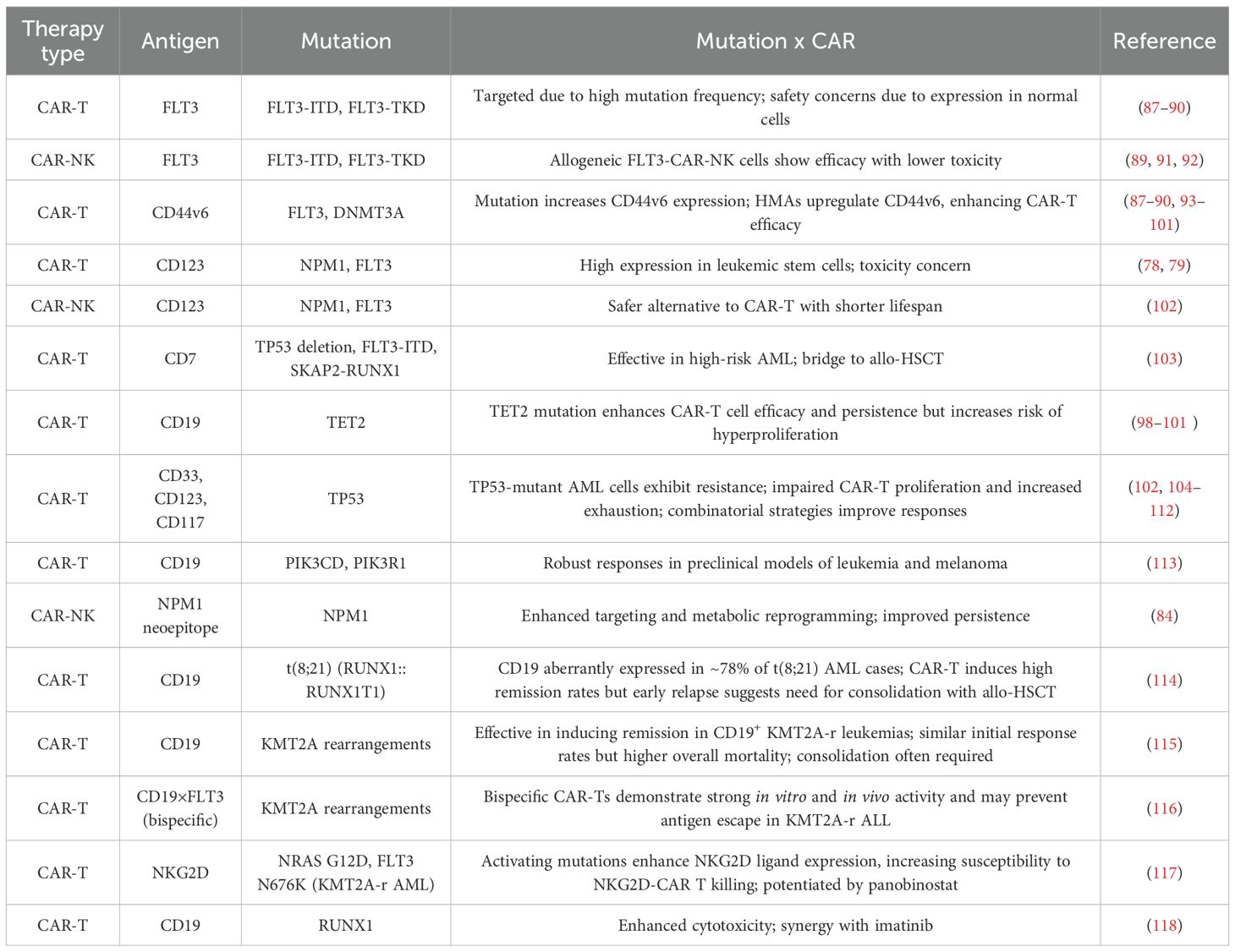 Overall, CAR-NK therapy represents a compelling and complementary cellular immunotherapy platform that combines enhanced safety, off-the-shelf manufacturing scalability, and improving persistence, positioning it as a pivotal option in the future immuno-oncology arsenal. However, since CAR-NK trials are still recent, the literature on the effect of AML mutations on CAR-NK cell therapy remains scarce.