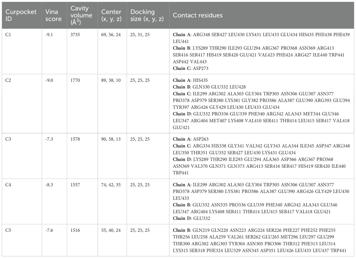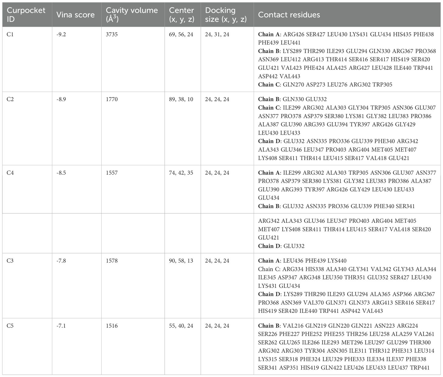 Potential drugs targeting NR1H3 were identified using the DSigDB database (https://dsigdb.tanlab.org/DSigDBv1.0/). Drug molecule structures were acquired from PubChem (https://pubchem.ncbi.nlm.nih.gov/), while NR1H3’s 3D structure came from the PDB (https://www.rcsb.org/). Subsequently, protein-ligand blind docking was carried out via the CB-Dock2 platform (https://cadd.labshare.cn/cb-dock2/index.php). This process utilized the CurPocket algorithm, which detects surface curvature-based cavities to predict potential binding sites on the NR1H3 protein, followed by performing blind docking of the selected drug molecules to these identified regions.