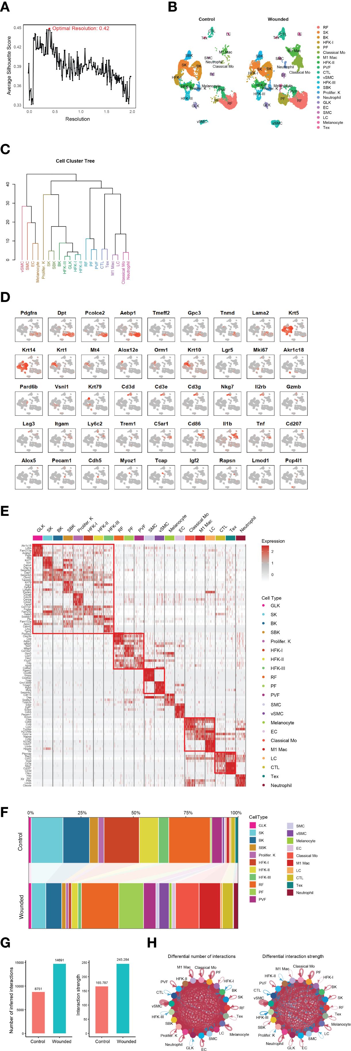 Figure 1. Comprehensive analysis of cell type identification and dynamics in control and wounded mouse skin. (A) Silhouette score analysis used to determine the optimal clustering resolution (e.g., 0.42 shown) for downstream cell type identification. (B) UMAP plot illustrating the distribution of identified cell types from control and wounded mouse skin samples. (C) Dendrogram depicting the hierarchical relationships among the 21 annotated cell types (annotated). (D) Feature plots showing the expression of canonical gene markers for various cell types overlaid on the UMAP projection. Markers include: Pan-Fibroblast (Pdgfra, Dpt); Reticular Fibroblast (Pcolce2, Aebp1); Papillary Fibroblast (Tmeff2, Gpc3); Perivascular Fibroblast (Tnmd, Lama2); Pan-Keratinocytes (Krt5, Krt14); Spinous Keratinocytes (Krt1, Mt4); Suprabasal Keratinocytes (Alox12e, Orm1, Krt10); HFH-I (Lgr5); Proliferating Keratinocytes (Mki67); Granular Layer Keratinocytes (Akr1c18); Basal Keratinocytes (Pard6b); HFK-II (Vsnl1), HFK-II (Krt79); General CTL (Cd3d, Cd3e, Cd3g, Nkg7); Activating T cells (Il2rb); Effector T cells (Gzmb); Exhausted T cells (Tex; Lag3); Classical Monocytes (Mo; Itgam, Ly6c2); Neutrophils (Trem1, C5ar1); M1 Macrophages (Cd86, Il1b, Tnf); Langerhans Cells (LC; Cd207, Alox5); Endothelial Cells (EC; Pecam1, Cdh5); Smooth Muscle Cells (SMC; Myoz1, Tcap); Melanocytes (Rapsn); and Vascular Smooth Muscle Cells (VSMC; Lmod1, Pcp4l1). (E) Heatmap displaying Differentially Expressed Genes (DEGs) between wounded and control conditions across identified cell clusters. (F) Stacked bar plot illustrating changes in cellular composition (proportions of cell types) between wounded and control mouse skin biopsies. (G) Bar plots summarizing overall cell-cell interaction numbers and strengths in wounded versus control skin. (H) Circular plots depicting differential cell-cell interaction numbers and strengths between specific cell types in wounded versus control skin.
