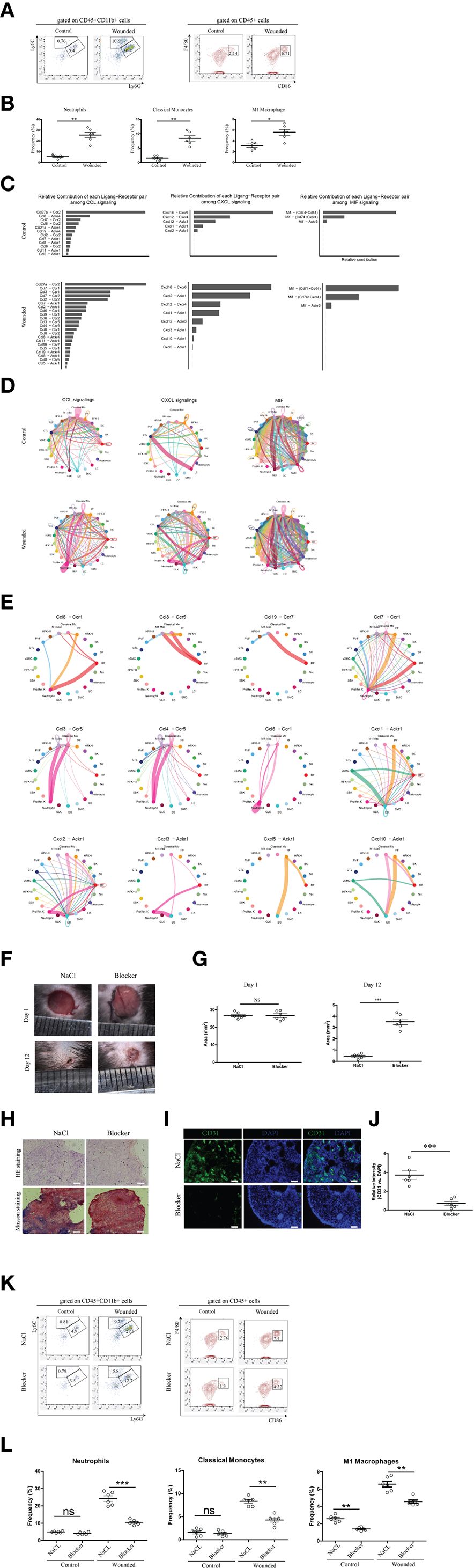Figure 2. Chemotactic signal analysis of neutrophils, classical monocytes, and m1 macrophages in wounded skin. (A) Representative flow cytometry plots of phagocytes (mainly neutrophils, classical monocytes and M1 macropahges) from control and wounded skin samples, gated on CD45+CD11b+ populations. (B) Statistical dot plots comparing the relative frequencies of neutrophils, classical monocytes, and M1 macrophages in control versus wounded skin samples. Each dot corresponds to a single readout from one mouse, six mice in each group. Data are representative of findings from three independent experiments. Statistical significance is denoted as follows: ***p < 0.001. (C) Bar graphs depicting the relative contribution of each ligand-receptor pair (e.g., CCL, CXCL) to chemotactic signaling in neutrophils, classical monocytes, and M1 macrophages, comparing control and wounded conditions. (D) Circular plots illustrating cell-cell interaction networks and their strengths for Neutrophils, Classical Monocytes, and M1 Macrophages, with comparisons between control and wounded conditions. (E) Detailed circular plots showing differential cell-cell interaction strengths and numbers for specific ligand-receptor pairs (e.g., CCL-, CXCL-, CX3CR1-Akt) in wounded biopsies across the different cell types. (F) Representative images of skin wounds in mice treated with NaCl (Control) or Blocker at Day 1 and Day 12 post-injury. Scale bars indicate 100 μm. The blocker cocktail comprised BX471 (a CCR1 antagonist), Maraviroc (a CCR5 antagonist), and Blocking Peptide LS-E41165 (an ACKR1 inhibitor). (G) Quantitative analysis of wound area (mm²) in mice treated with NaCl or Blocker at Day 1 and Day 12. Each dot corresponds to a single readout from one mouse, six mice in each group. Statistical significance is denoted as follows: NS (not significant), ***p < 0.001. (H) Histological assessment of skin samples treated with NaCl or Blocker, stained with Hematoxylin and Eosin (HE) and Masson’s trichrome. Scale bars represent 100 µm. (I) Immunofluorescence staining of skin samples treated with NaCl or Blocker, showing CD31 (green) and DAPI (blue) staining. Scale bars represent 50 µm. (J) Quantitative analysis of relative CD31 versus DAPI intensity in skin samples treated with NaCl or Blocker. Each dot corresponds to a single readout from one mouse, six mice in each group. Data are representative of findings from two independent experiments. Statistical significance is denoted as follows: ***p < 0.001. (K) Representative flow cytometry plots illustrating the reduced frequencies of neutrophils, classical monocytes, and M1 macrophages in wounded skin following administration of a cocktail, compared to controls injected with saline. (L) Statistical dot plots comparing the frequency percentages of neutrophils, classical monocytes, and M1 macrophages between control and wounded skin samples, with statistical significance indicated (ns = not significant, *p<0.05, **p < 0.01, ***p < 0.001). Each dot corresponds to a single readout from one mouse, six mice in each group. Data are representative of findings from three independent experiments.