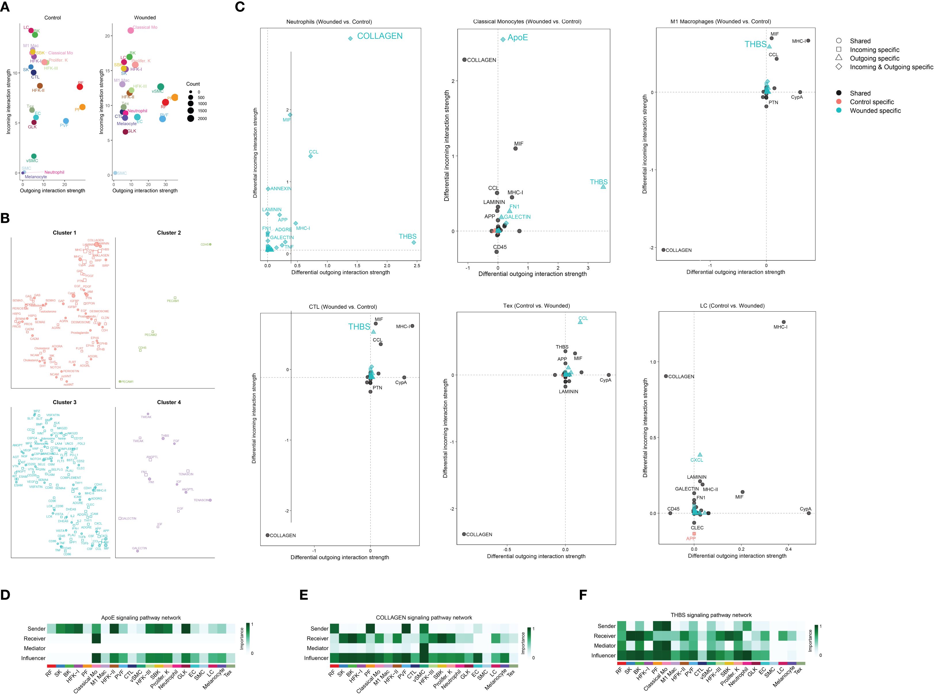 Figure 3. Comprehensive analysis of cell-cell interaction dynamics and signaling pathways in wound healing microenvironment via cellchat. (A) Scatter plot comparing the incoming and outgoing interaction strengths of various cell types between control and wounded skin samples, as determined by CellChat analysis. Cell types include Langerhans cells (LC), basal keratinocytes (BK), M1 macrophages (M1 Mac), suprabasal keratinocytes (SBK), proliferating keratinocytes (Prolifer. K), spinous keratinocytes (SK), cytotoxic T lymphocytes (CTL), reticular fibroblasts (RF), hair follicle keratinocytes I and II (HFK-I, HFK-II), hair follicle keratinocytes III (HFK-III), effector T cells (Tex), endothelial cells (EC), granular layer keratinocytes (GLK), perivascular fibroblasts (PVF), melanocytes, vascular smooth muscle cells (VSMC), smooth muscle cells (SMC), and classical monocytes (Classical Mo). Interaction strengths are scaled by count, with circle sizes corresponding to cell abundance (0 to 2000 cells). (B) Network plots illustrating the ligand-receptor interactions or signaling molecules within four distinct cell clusters, as determined by CellChat analysis. Cluster 1 features interactions involving collagen, laminin, MHC molecules, prostaglandins, and cadherins; Cluster 2 highlights CDH5 and PECAM1; Cluster 3 includes MPZ, visfatin, slit proteins, and angiopoietins; and Cluster 4 is enriched with TWEAK, tenascin, galectin, and IGF. Node sizes and connections represent the relative abundance and interaction strengths of the molecules, respectively. (C) Scatter plots illustrating differential incoming and outgoing interaction strengths of ligand-receptor pairs between wounded and control skin samples, as determined by CellChat analysis. Panels depict: (1) Neutrophils, with key ligands including COLLAGEN and CCL; (2) Classical Monocytes, with APOE and COLLAGEN; (3) M1 Macrophages, with THBS, MHC-II, and CYPA; (4) Cytotoxic T Lymphocytes (CTL), with THBS, CCL, and MHC-II; (5) Effector T cells (Tex), with COLLAGEN, CYPA, and APP; and (6) Langerhans Cells (LC), with COLLAGEN, LAMININ, and CLEC. Symbols indicate shared (○), incoming-specific (□), outgoing-specific (△), incoming and outgoing-specific (⋄), control-specific (•), and wounded-specific (▴) interactions, with statistical significance inferred from differential strengths. (D) Heatmap illustrating the ApoE signaling pathway network, depicting the importance of sender, receiver, mediator, and influencer roles across cell. Importance is scaled from 0 (low) to 1 (high). (E) Heatmap illustrating the COLLAGEN signaling pathway network, highlighting the importance of sender, receiver, mediator, and influencer roles across the same cell types, with importance scaled from 0 (low) to 1 (high). (F) Heatmap illustrating the THBS signaling pathway network, showing the importance of sender, receiver, mediator, and influencer roles across the same cell types, with importance scaled from 0 (low) to 1 (high).