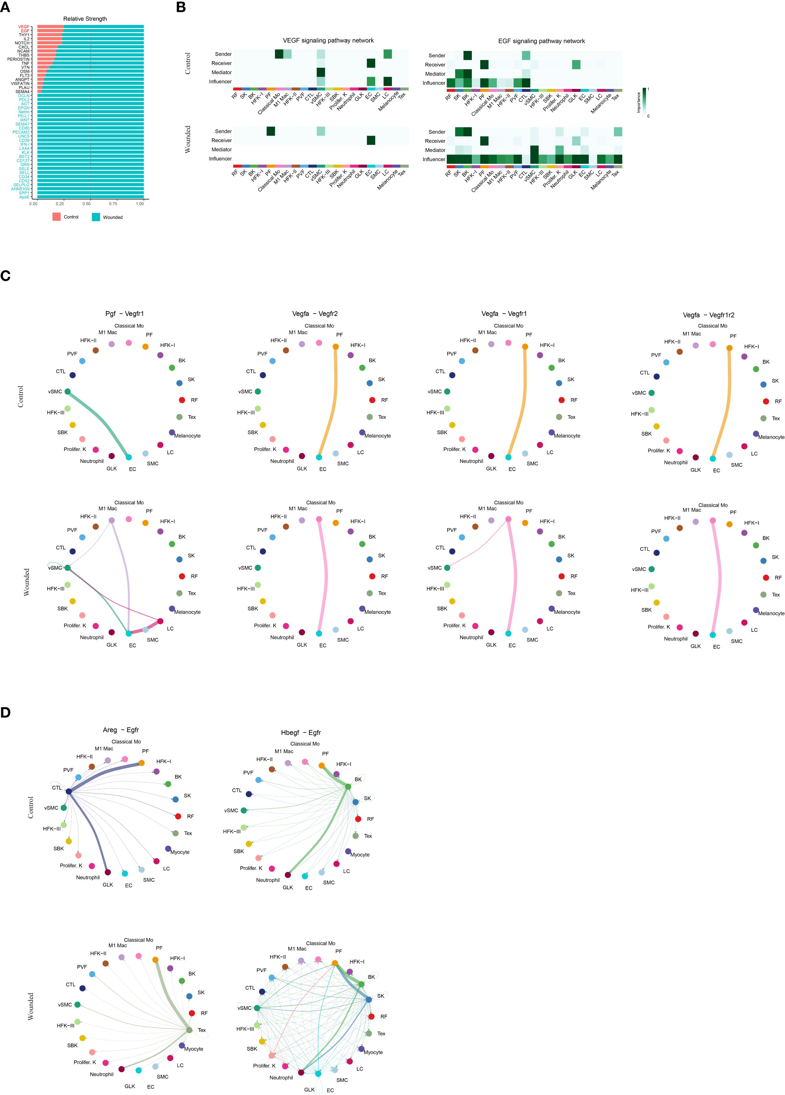 Figure 4. Comparative Analysis of VEGF and EGF Signaling Pathways in Wound Healing Microenvironment. (A). Bar plot illustrating the relative strengths of key ligands. (B). Heatmaps illustrating the VEGF and EGF signaling pathway networks, as determined by CellChat analysis, depicting the importance of sender, receiver, mediator, and influencer roles across cell types. Importance is scaled from 0 (low, light color) to 1 (high, dark color), with separate panels for control and wounded states. (C). Circular plots illustrating cell-cell interaction networks for the Pgf-Vegfr1, Vegfa-Vegfr2, Vegfa-Vegfr1 and Vegfa-Vegfr1r2 signaling pathways, as determined by CellChat analysis, comparing control and wounded skin samples. (D).Circular plots illustrating cell-cell interaction networks for the Areg-Egfr and Hbegf-Egfr signaling pathways, as determined by CellChat analysis, comparing control and wounded skin samples.