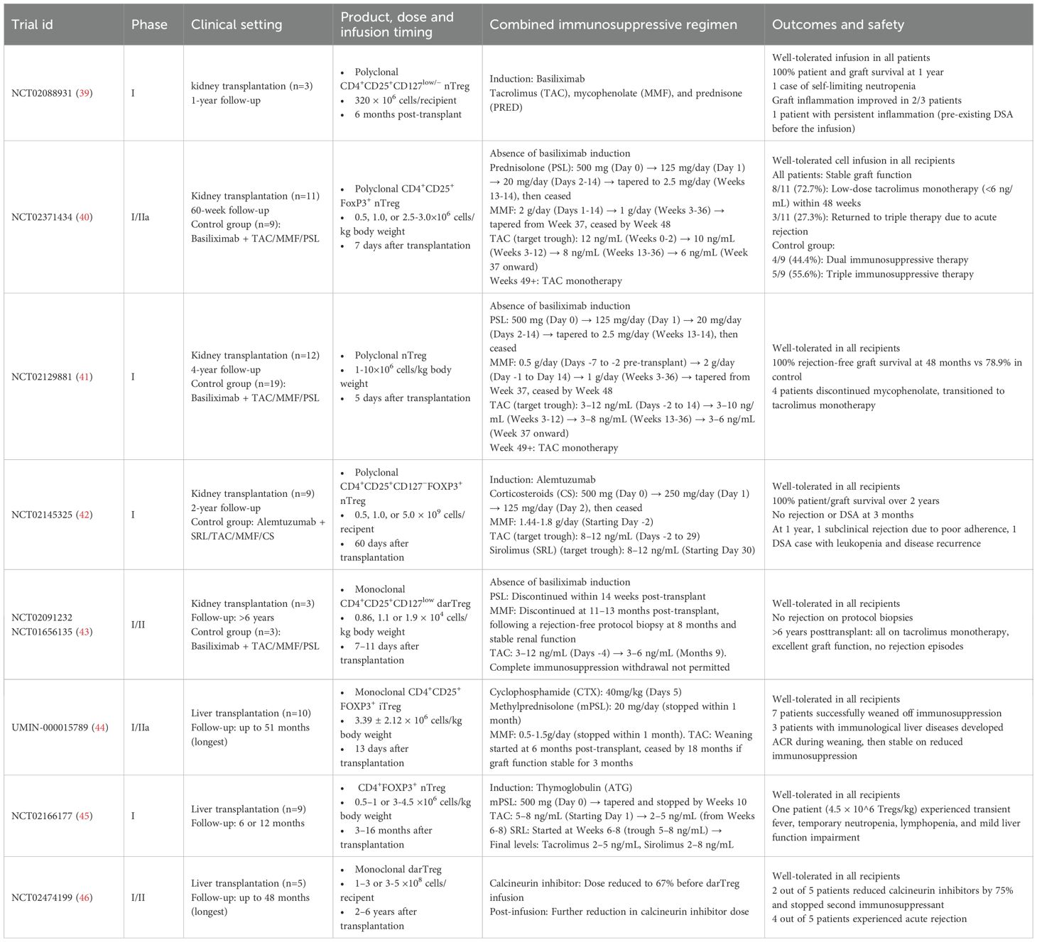 While Treg-based therapy has not yet been tested in clinical trials of lung transplantation, advances in kidney and liver transplantation (summarized in Table 1) provide critical benchmarks, demonstrating reduced rejection rates and stable graft function. However, caution is required when extrapolating these findings to lung transplantation, owing to its distinct immune microenvironment. Nevertheless, these cross-disciplinary insights provide a framework for designing Treg-based trials in lung transplantation, as outlined in the following sections.