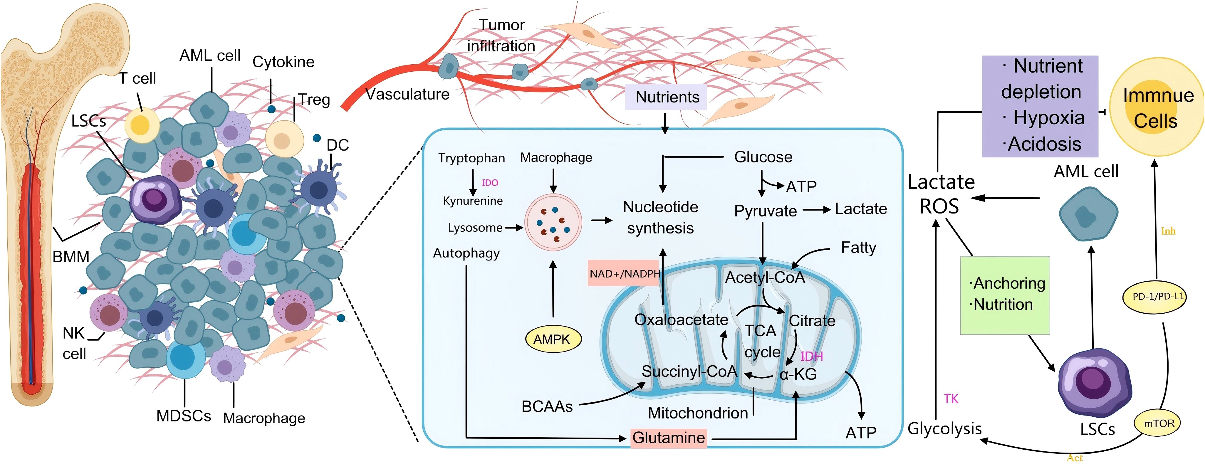 Figure 2. AML-mediated metabolic immune regulation in the BMM. On the left side, AML cells infiltrate the bone marrow and secrete cytokines that recruit immunosuppressive cells such as regulatory T cells (Tregs) and MDSCs, which collectively inhibit the anti-tumor activities of T cells and NK cells. This process establishes an “immune-tolerant microenvironment” that shields AML cells from immune-mediated elimination. In the central metabolic pathway, AML cells utilize the Warburg effect—enhanced glycolysis leading to lactic acid production—to rapidly generate ATP. Accumulated lactic acid induces microenvironmental acidosis, further dampening immune responses. Additionally, glutamine catabolism replenishes the tricarboxylic acid (TCA) cycle, supplying precursors for nucleotide and lipid biosynthesis. Mutations in IDH result in the oncometabolite 2-hydroxyglutarate (2-HG), which disrupts normal DNA methylation patterns and contributes to malignant transformation. Under conditions of nutrient deprivation, AMPK-mediated autophagy is activated to degrade cellular components and sustain leukemic cell survival. On the right side, PD-L1/PD-L1 on the surface of AML cells enhances their own glycolysis by activating pathways such as PI3K/Akt/mTOR (Warburg effect), while binding to PD-1 on the surface of T cells, inhibiting their glycolysis and amino acid metabolism, promoting their transformation to fatty acid oxidation, and ultimately leading to T cell failure. They also attach to stromal cells through adhesion molecules, thereby evading chemotherapy and immune surveillance. Activation of the mTOR signaling pathway enhances metabolic activity and stemness, contributing to therapeutic resistance and disease relapse in AML.