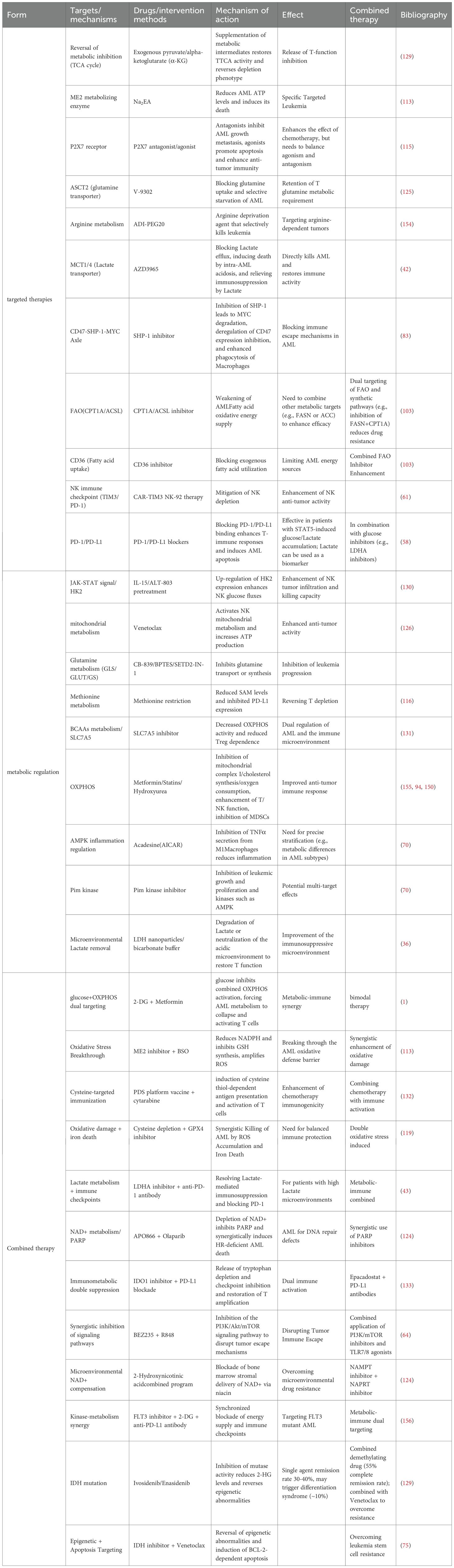 T lymphocytes are essential for eliminating infections and destroying AML cells. When stimulated to become effector T cells, their metabolic pattern changes dramatically. While resting memory T cells primarily rely on OXPHOS and FAO metabolism for ATP production, they can exhibit 20–50 times higher levels of glycolysis and a marked increase in fatty acid uptake (21, 22). Different immune cells have distinct metabolic profiles: M2-like macrophages use both FAO and OXPHOS, T helper 17 (Th17) cells and regulatory T cells (Tregs) are more prone to FAO metabolism, while activated neutrophils, M1-type macrophages, and dendritic cells (DCs) are primarily glycolytic (23). These metabolic patterns dictate the differentiation fate of immune cells in addition to promoting cellular proliferation. Understanding the nature of immune responses and regulatory mechanisms hence requires a thorough investigation of immune cell metabolic reprogramming.