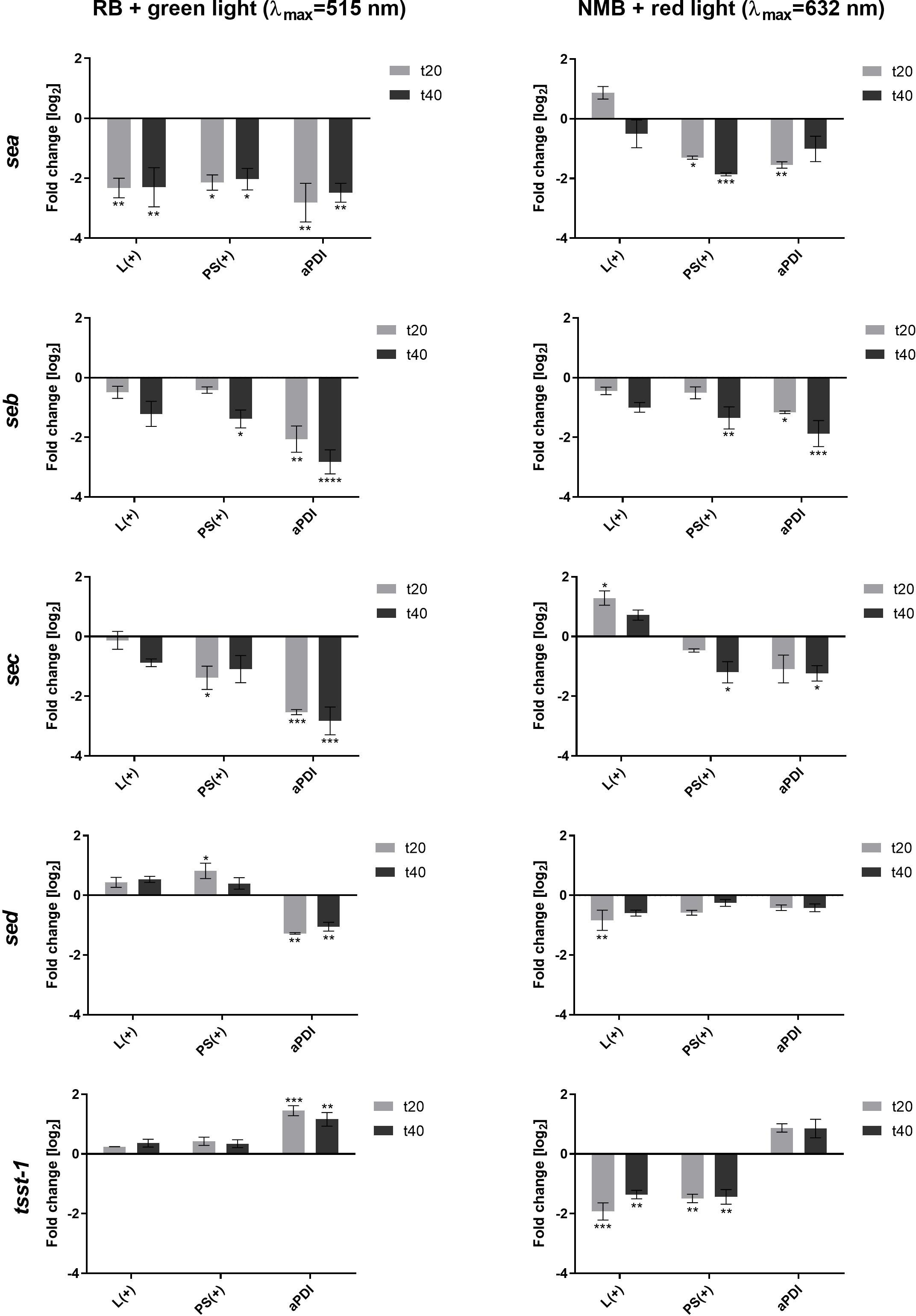 Figure 1. Changes in the expression of staphylococcal toxin genes after sublethal aPDI treatment: relative expression level of sea, seb, sec, sed and tsst-1 toxin genes after sublethal aPDI treatment. The experiment was performed with either rose bengal (RB) with green light or new methylene blue (NMB) with red light. Significance at respective p-values is marked with asterisks [*p < 0.05; **p < 0.01; ***p < 0.001; ****p < 0.0001] with respect to untreated cells (0 J/cm2, 0 µM RB/NMB). Error bars represent the standard error of the mean. L(+), bacterial cell treated with light alone (green λmax=515 nm/red λmax=632 nm); PS(+), cells treated with RB or NMB alone in the dark; aPDI, bacterial cells treated with RB and green light or NMB and red light; t20 and t40, the time points after the irradiation process at which samples were collected.