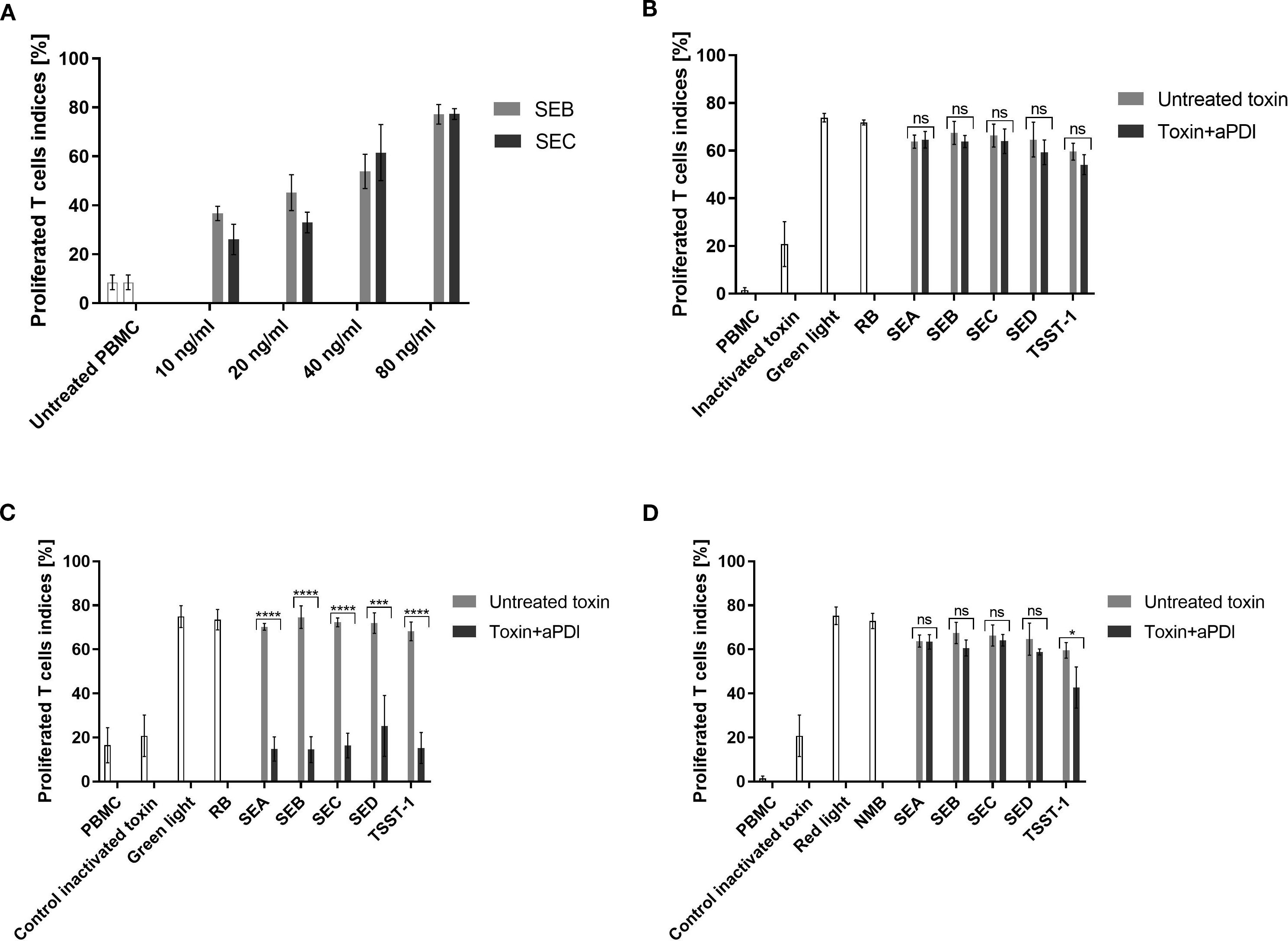 Figure 2. T-cell proliferation assay evaluating toxin activity following aPDI treatment. (A) Dose-response curve showing T-cell proliferation induced by staphylococcal toxins. Bars represent mean proliferation indices from three independent donors; error bars indicate standard deviation (SD). Prior to incubation with peripheral blood mononuclear cells (PBMC), toxins were treated as follows: (B) sublethal aPDI using rose bengal (RB, 0.5 µM) and green light (515 nm, 35 mW/cm², 12 J/cm²); (C) lethal aPDI using RB (5 µM) and green light (515 nm, 35 mW/cm², 40 J/cm²); (D) sublethal aPDI using new methylene blue (NMB, 5 µM) and red light (632 nm, 20 mW/cm², 32.5 J/cm²). Bars represent means ± SD from three donors. Significance at respective p-values is marked with asterisks: *p < 0.05; ***p < 0.001; ****p < 0.0001. Toxin controls include heat-inactivated samples (heated at 95°C for 5 min), samples treated with light only (Green light/Red light), samples treated with photosensitizer only (RB/NMB). Toxin designations (SEA, SEB, SEC, SED, TSST-1) refer to proteins treated with antimicrobial photodynamic inactivation (aPDI). ns, non significant.