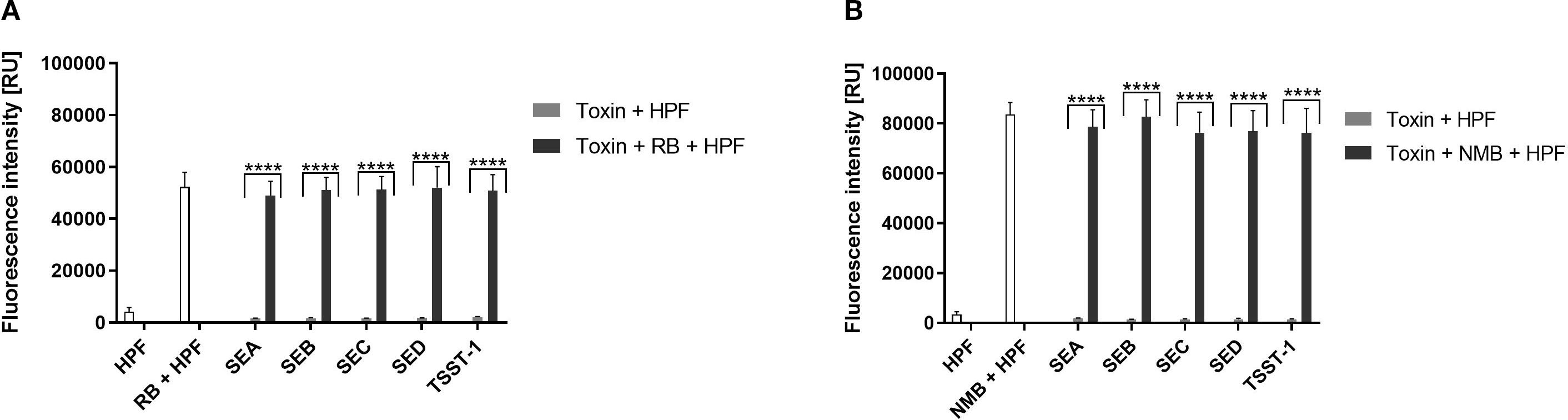 Figure 3. Detection of Reactive Oxygen Species (ROS). (A) RB + green light: Cell-free suspensions containing purified staphylococcal enterotoxins (SEA, SEB, SEC SED, TSST-1) and/or rose bengal (RB, 5 µM) were incubated with ROS-sensitive fluorescent probe hydroxyphenyl fluorescein (HPF, 5 µM) to detect hydroxyl radicals (·OH) upon irradiation with green light (λmax = 515 nm, 35 mW/cm², 40 J/cm²). Data are presented as the mean ± standard deviation (SD) from three independent experiments. (B) NMB + red light: Cell-free suspensions containing purified enterotoxins and/or new methylene blue (NMB, 5 µM) were incubated with HPF (5 µM) for detection of hydroxyl radicals (·OH) following irradiation with red light (λmax = 632 nm, 20 mW/cm², 32.5 J/cm²). Data are presented as the mean ± SD from three independent experiments. Fluorescence intensity is reported in relative units (RU).