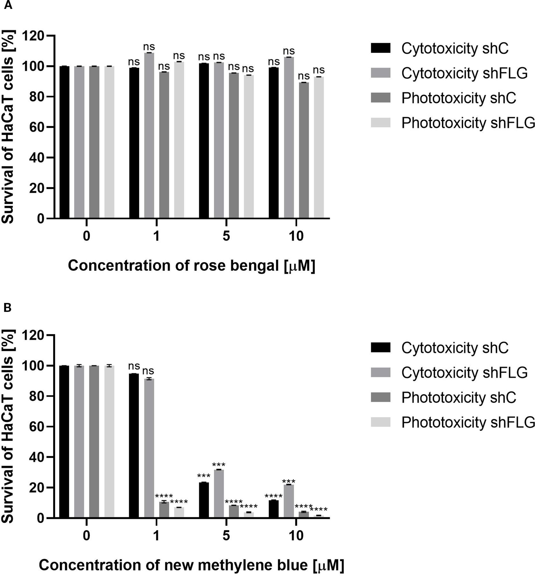 Figure 4. HaCaT cell viability assay. (A) Two cell lines – shC HaCaT and shFLG HaCaT keratinocytes were treated with rose bengal (RB) and exposed to green light (λmax=515 nm, irradiance 35 mW/cm2, light dose 40 J/cm2) to test phototoxicity, or kept in the dark to test cytotoxicity. (B) The same cell lines were treated with new methylene blue (NMB) and red light (λmax=632 nm, irradiance 20 mW/cm2, light dose 32.5 J/cm2), or kept in the dark. In both experiments, cells (1×104/well) were incubated with increasing photosensitizer concentrations. Untreated cells (0 µM) served as controls. Bars show mean ± SD from three independent experiments. Significant differences vs. control are marked (***p < 0.0001; ****p < 0.0001; ns, non significant).