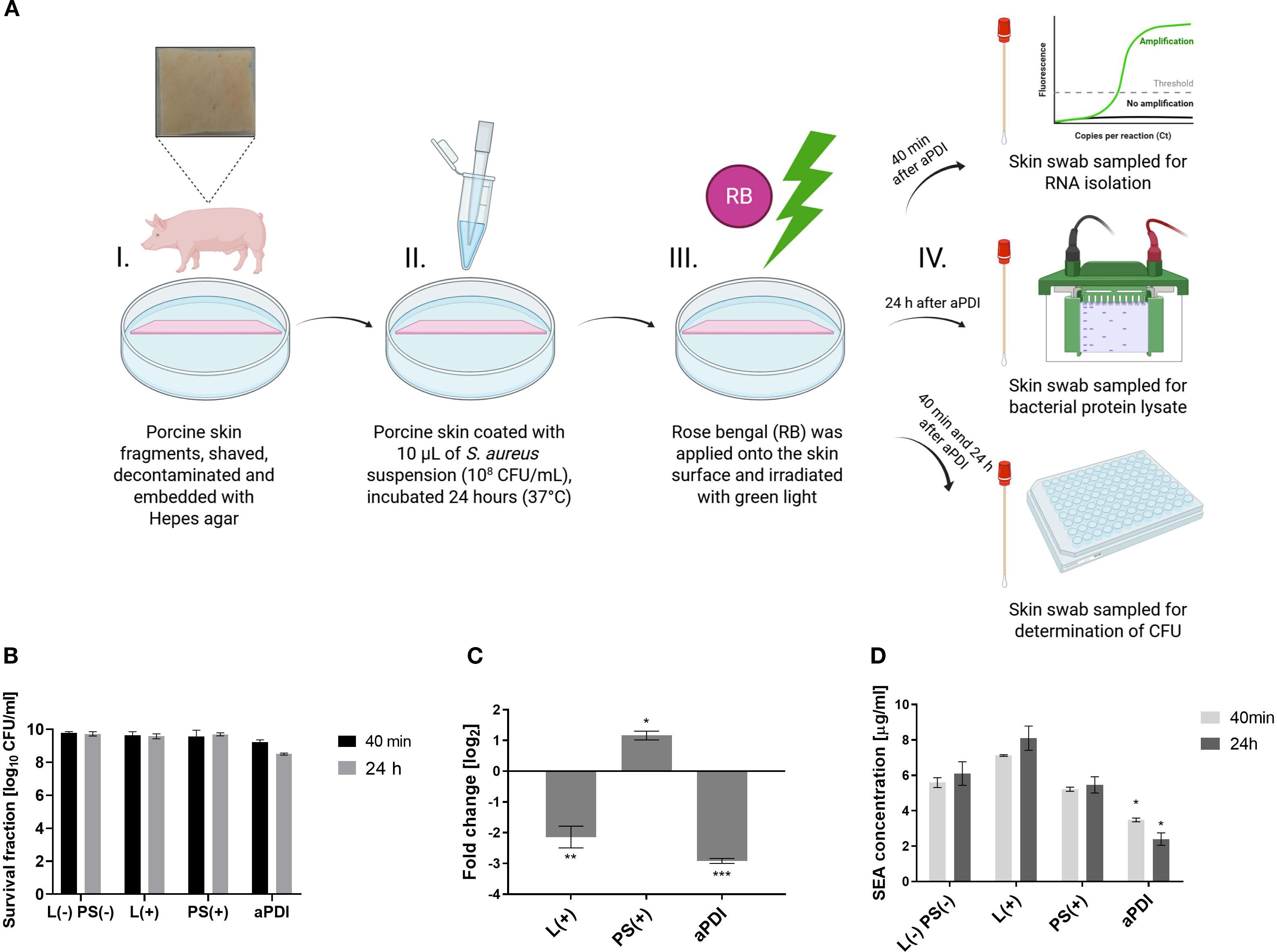Forty minutes post-aPDI, skin samples were swabbed for RNA extraction using RNAlater-moistened swabs. Swabs were incubated in a lysis buffer (20 mM Tris-HCl pH 8.0; 2mM EDTA pH 8.0; 1.2% Triton X-100) with lysostaphin (37°C, 40 min), followed by RNA isolation, cDNA synthesis, and qPCR (per Sections 2.4 & 2.5).
