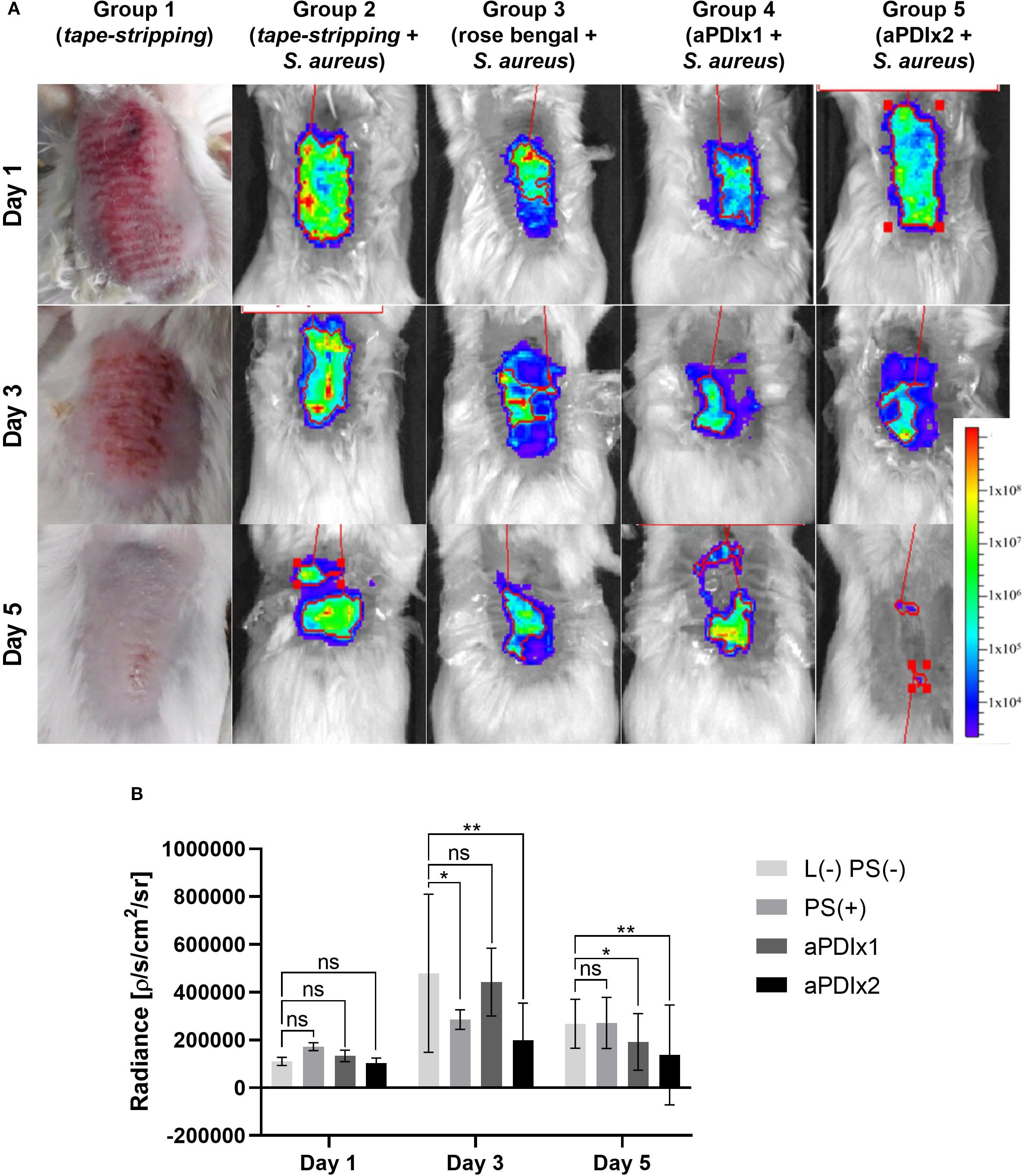 Porcine skin (2 × 2 cm), prepared following Maisch et al. (49), was cleaned, disinfected, and placed on Hepes agar. Porcine skin samples were inoculated with S. aureus Xen40 (107 CFU/mL; Perkin Elmer, USA) and incubated at 37°C for 24 h, resulting in visible discoloration (Supplementary Figure S5). Four experimental conditions were tested: