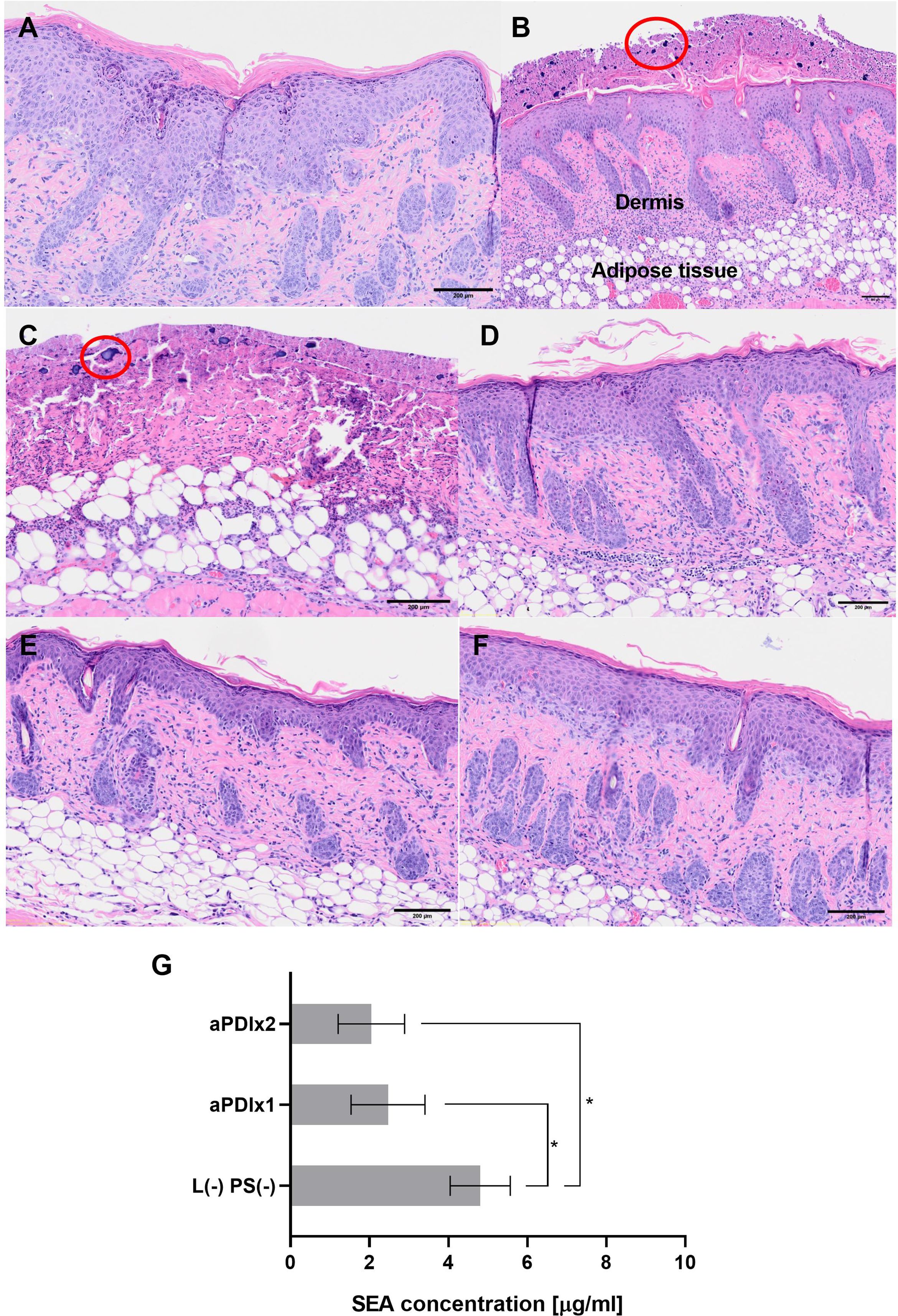 Ex vivo porcine skin models are increasingly used to evaluate aPDI under physiologically relevant conditions. In most previous studies, aPDI was applied immediately after bacterial inoculation, representing short-term protocols that does not allow for bacterial adaptation or colonization comparable to natural S. aureus persistence on human skin (49, 64–66). To address this, we developed an ex vivo model that allows overnight bacterial colonization, providing a more realistic environment for assessing aPDI’s effects on both transcript and protein levels. Using this model, we demonstrated that RB-mediated aPDI significantly reduced enterotoxin A levels, underscoring its potential for topical applications targeting S. aureus virulence (Figure 5).