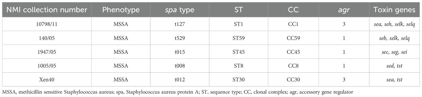 Staphylococcus aureus reference strains were generously provided by Dr Joanna Empel from the National Medicines Institute (NMI), Warsaw, Poland. These strains were analyzed for toxin genes and genetic background (Table 1). S. aureus was cultured in 5 mL tryptic soy broth (TSB, bioMérieux, France) under aerobic conditions at 37°C with shaking (150 rpm, Innova 40, New Brunswick Scientific, Sweden) for 16–20 h.
