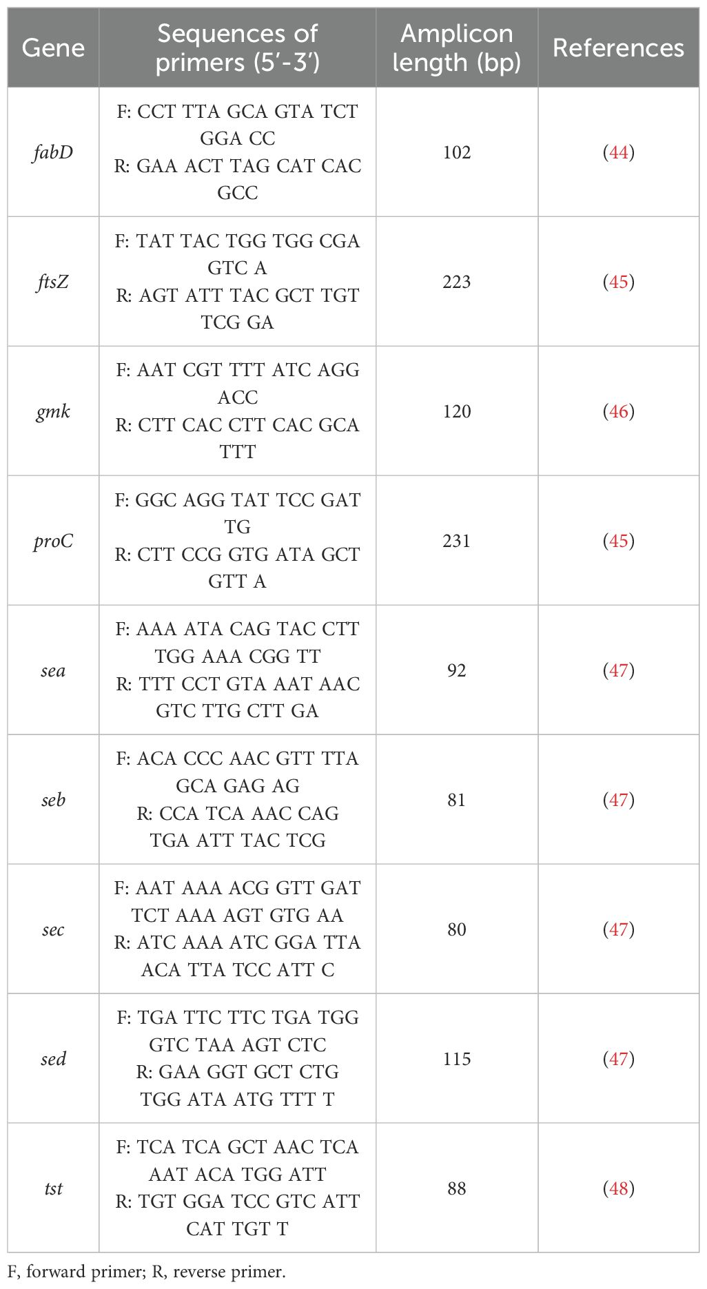 47. Klotz M, Opper S, Heeg K, and Zimmermann S. Detection of staphylococcus aureus enterotoxins A to D by real-time fluorescence PCR assay. J Clin Microbiol. (2003) 41:4683–7. doi: 10.1128/JCM.41.10.4683-4687.2003