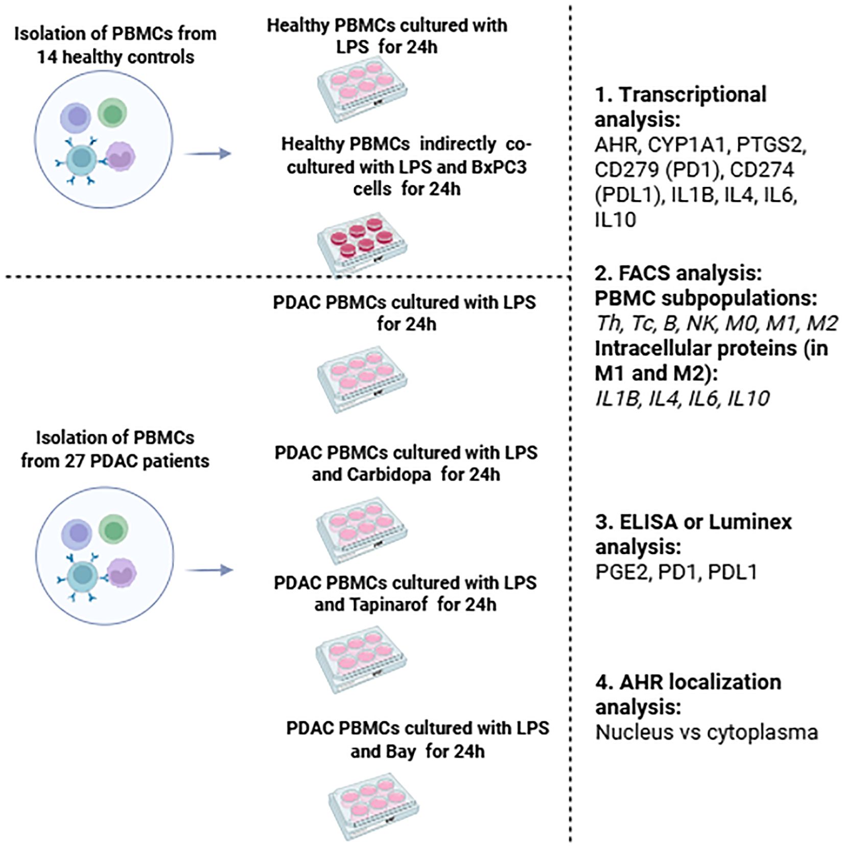 Figure 1. Schematic overview of the study design, including PBMC isolation from PDAC patients and controls: healthy PBMCs cultivation and indirect co-cultivation with BxPC-3 cells, PDAC PBMCs treatment with AHR modulators, and subsequent immunological analyses of all groups. The main criteria for this study group of cancer patients were as follows.