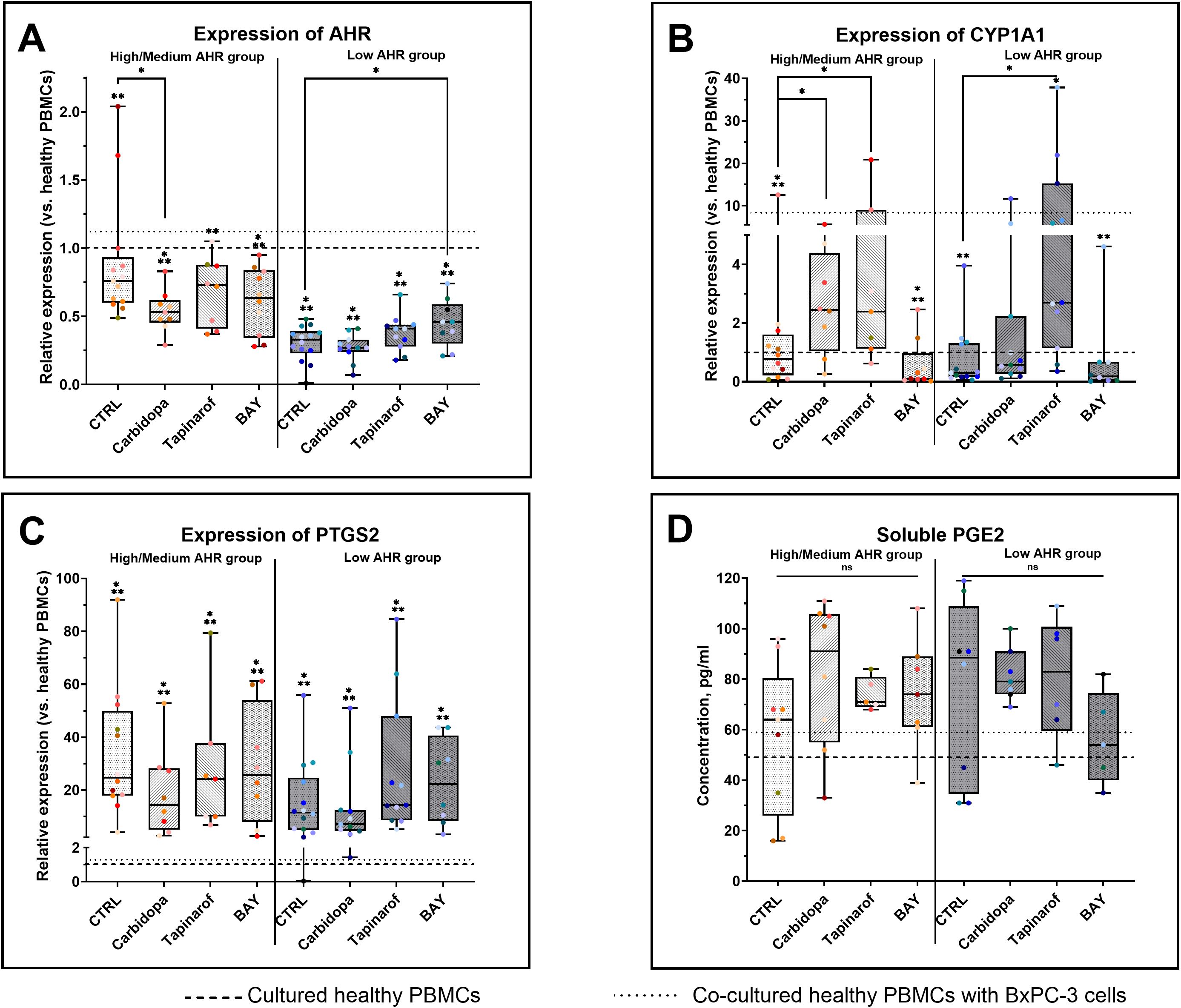 Figure 2. Effects of AHR modulators on gene (qPCR) and protein (ELISA) markers in PDAC-derived PBMCs. AHR gene expression (A), CYP1A1 (B), PTGS2 (C), and PGE2 levels (D) were analyzed after treatment with Carbidopa, Tapinarof, or BAY. CTRL refers to untreated PDAC PBMCs stimulated with LPS but without AHR modulators or tumor co-culture. Healthy indicates LPS-stimulated PBMCs from non-cancer donors, and co-cultured refers to healthy PBMCs indirectly co-cultured with BxPC-3 cells. Data shown as medians with full range. Each dot represents one PDAC patient; data from the same individual are shown in the same color across all treatment conditions. Sample numbers (n) varied between assays and AHR expression groups due to differences in PBMC yield and viability (typically n = 5–13 for PDAC High/Medium AHR, n = 5–14 for PDAC Low AHR, and n = 7–14 for healthy donors; see Supplementary Table ST1 for details). *p < 0.05 vs. healthy; **p < 0.05 vs. co-cultured. ns – not significant.