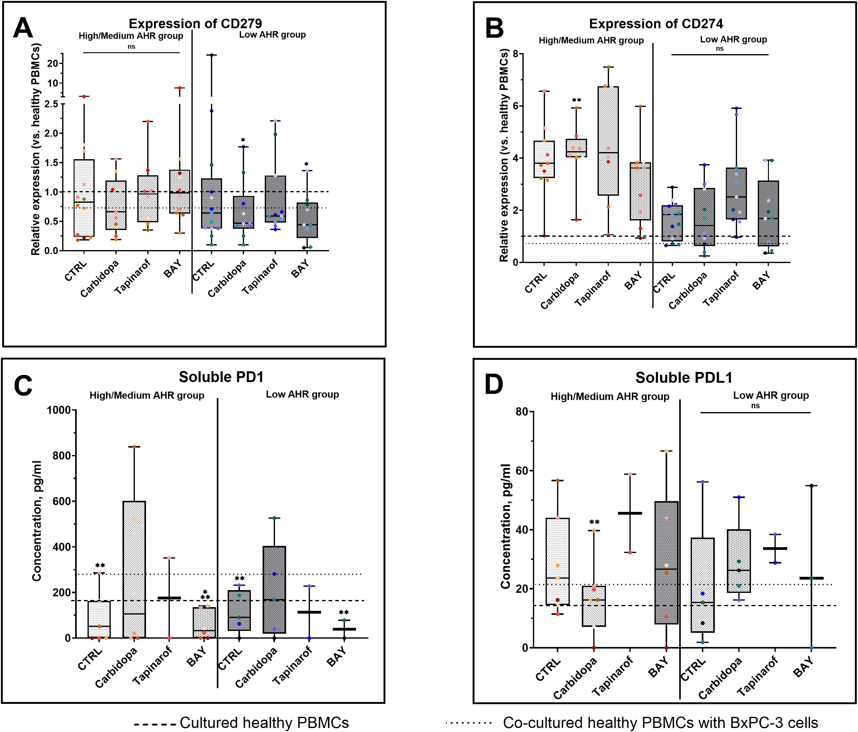 Figure 3. PD-1/PD-L1 gene (qPCR) and protein (ELISA) expression following AHR modulation. CD279 (PD-1) mRNA levels (A), CD274 (PD-L1) mRNA (B), soluble PD-1 (C), and soluble PD-L1 (D) were measured in AHR-stratified PDAC PBMCs after modulation. CTRL refers to untreated PDAC PBMCs stimulated with LPS but without AHR modulators or tumor co-culture. Healthy indicates LPS-stimulated PBMCs from non-cancer donors, and co-cultured refers to healthy PBMCs indirectly co-cultured with BxPC-3 cells. Healthy PBMCs and BxPC-3 co-cultured controls included. Data shown as medians with full range. Each dot represents one PDAC patient; data from the same individual are shown in the same color across all treatment conditions. Sample numbers (n) varied between assays and AHR expression groups due to differences in PBMC yield and viability (typically n = 2–12 for PDAC High/Medium AHR, n = 2–13 for PDAC Low AHR, and n = 8–14 for healthy donors; see Supplementary Table ST1 for details). *p < 0.05 vs. healthy; **p < 0.05 vs. co-cultured. ns – not significant.