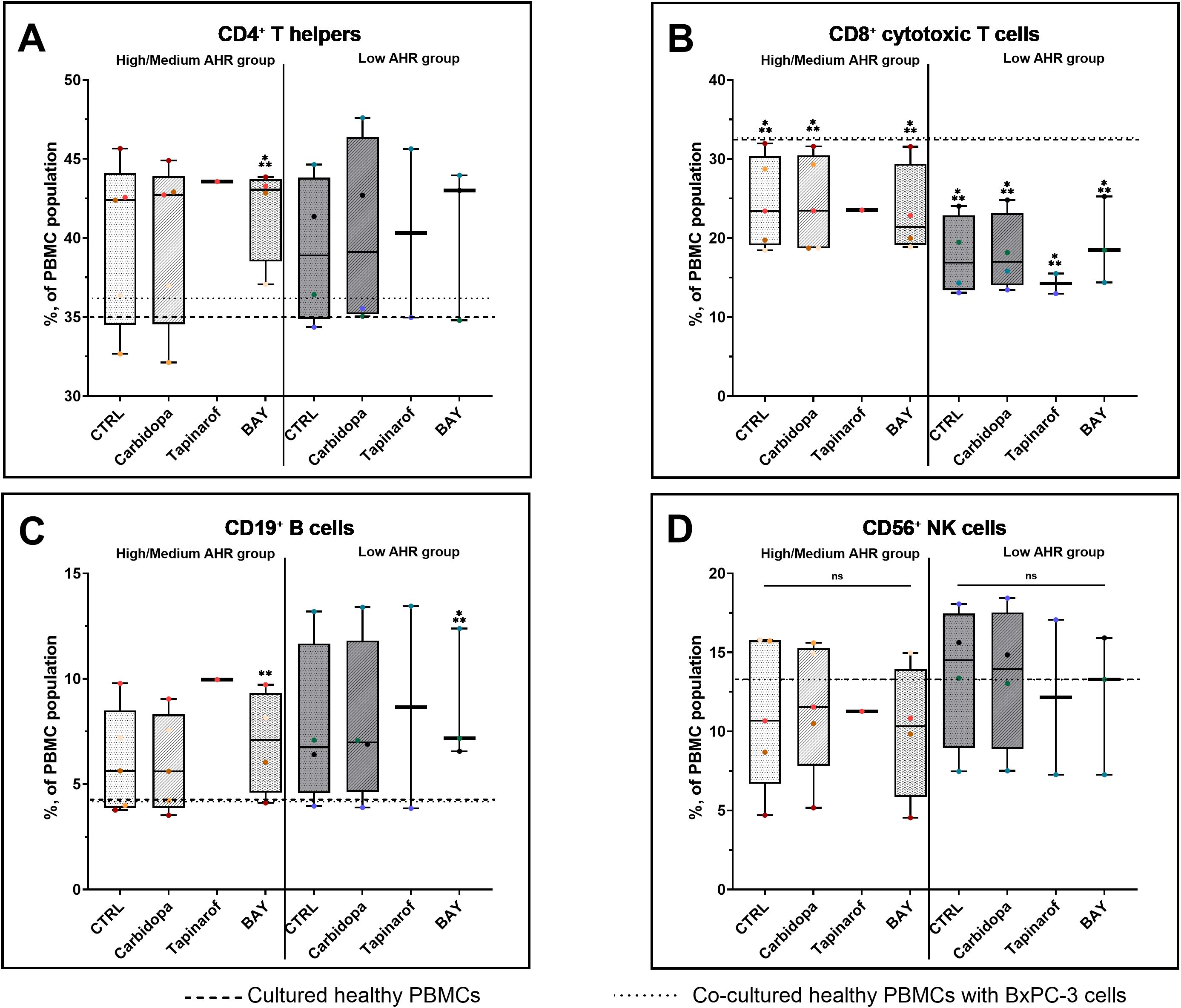 Figure 4. Lymphocyte subset (FC) distribution in PDAC PBMCs after AHR modulation. CD3+CD4+ T cells (A), CD3+CD8+ cytotoxic T cells (B), CD19+ B cells (C), and CD3-CD16+CD56+ NK cells (D) were quantified by flow cytometry. CTRL refers to untreated PDAC PBMCs stimulated with LPS but without AHR modulators or tumor co-culture. Healthy indicates LPS-stimulated PBMCs from non-cancer donors, and co-cultured refers to healthy PBMCs indirectly co-cultured with BxPC-3 cells. Healthy PBMCs and BxPC-3 co-cultured controls included. Data shown as medians with full range. Each dot represents one PDAC patient; data from the same individual are shown in the same color across all treatment conditions. Sample numbers (n) varied between assays and AHR expression groups due to differences in PBMC yield and viability (typically n = 1–5 for PDAC High/Medium AHR, n = 2–4 for PDAC Low AHR, and n = 11 for healthy donors; see Supplementary Table ST1 for details). *p < 0.05 vs. healthy; **p < 0.05 vs. co-cultured. ns – not significant.