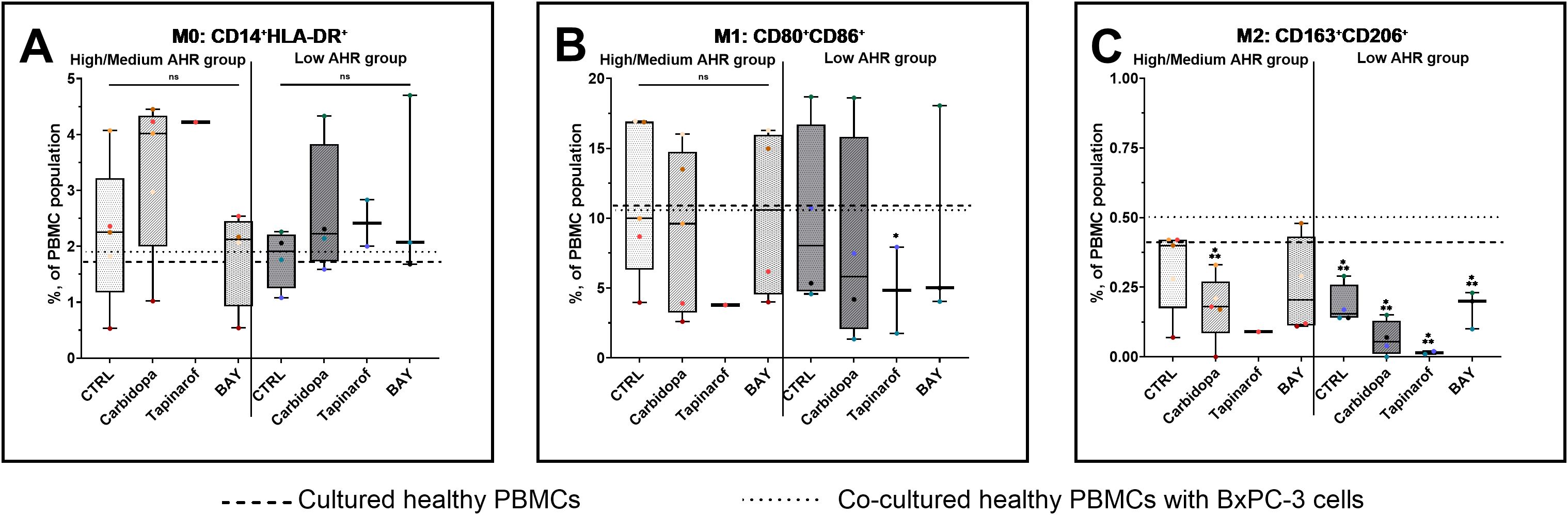 Figure 5. Monocyte (FC) polarization profile following AHR modulation. M0 monocytes (A), M1 monocytes (B), and M2 monocytes (C) were assessed in PDAC PBMCs stratified by baseline AHR expression. CTRL refers to untreated PDAC PBMCs stimulated with LPS but without AHR modulators or tumor co-culture. Healthy indicates LPS-stimulated PBMCs from non-cancer donors, and co-cultured refers to healthy PBMCs indirectly co-cultured with BxPC-3 cells. Healthy PBMCs and BxPC-3 co-cultured controls included. Data shown as medians with full range. Each dot represents one PDAC patient; data from the same individual are shown in the same color across all treatment conditions. Sample numbers (n) varied between assays and AHR expression groups due to differences in PBMC yield and viability (typically n = 1–5 for PDAC High/Medium AHR, n = 2–4 for PDAC Low AHR, and n = 11 for healthy donors; see Supplementary Table ST1 for details). *p < 0.05 vs. healthy; **p < 0.05 vs. co-cultured. ns – not significant.