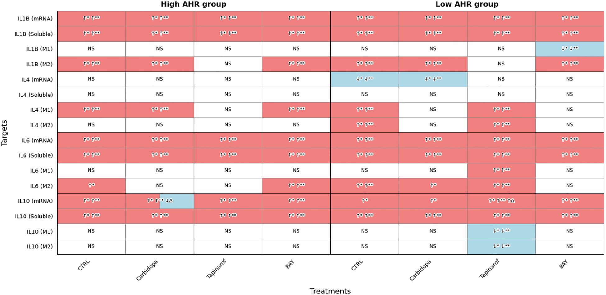 Figure 6. AHR pathway modulation alters IL1B, IL4, IL6, and IL10 expression (FC, Luminex) in PDAC PBMCs. Cytokine expression was assessed at mRNA, soluble, and intracellular levels in M1 and M2 monocytes following treatment with Carbidopa, Tapinarof, or BAY. Samples were stratified by baseline AHR expression. CTRL refers to untreated PDAC PBMCs stimulated with LPS but without AHR modulators or tumor co-culture. Healthy indicates LPS-stimulated PBMCs from non-cancer donors, and co-cultured refers to healthy PBMCs indirectly co-cultured with BxPC-3 cells. Sample numbers (n) varied between assays and AHR expression groups due to differences in PBMC yield and viability (typically n = 1–13 for PDAC High/Medium AHR, n = 2–13 for PDAC Low AHR, and n = 11–14 for healthy donors; see Supplementary Table ST1 for details). Color coding: red = upregulated; blue = downregulated; white = no significant change; ↑/↓ indicate directional changes; Δ – significant vs. CTRL PDAC; *p < 0.05 vs. healthy; **p < 0.05 vs. co-cultured; NS, not significant.