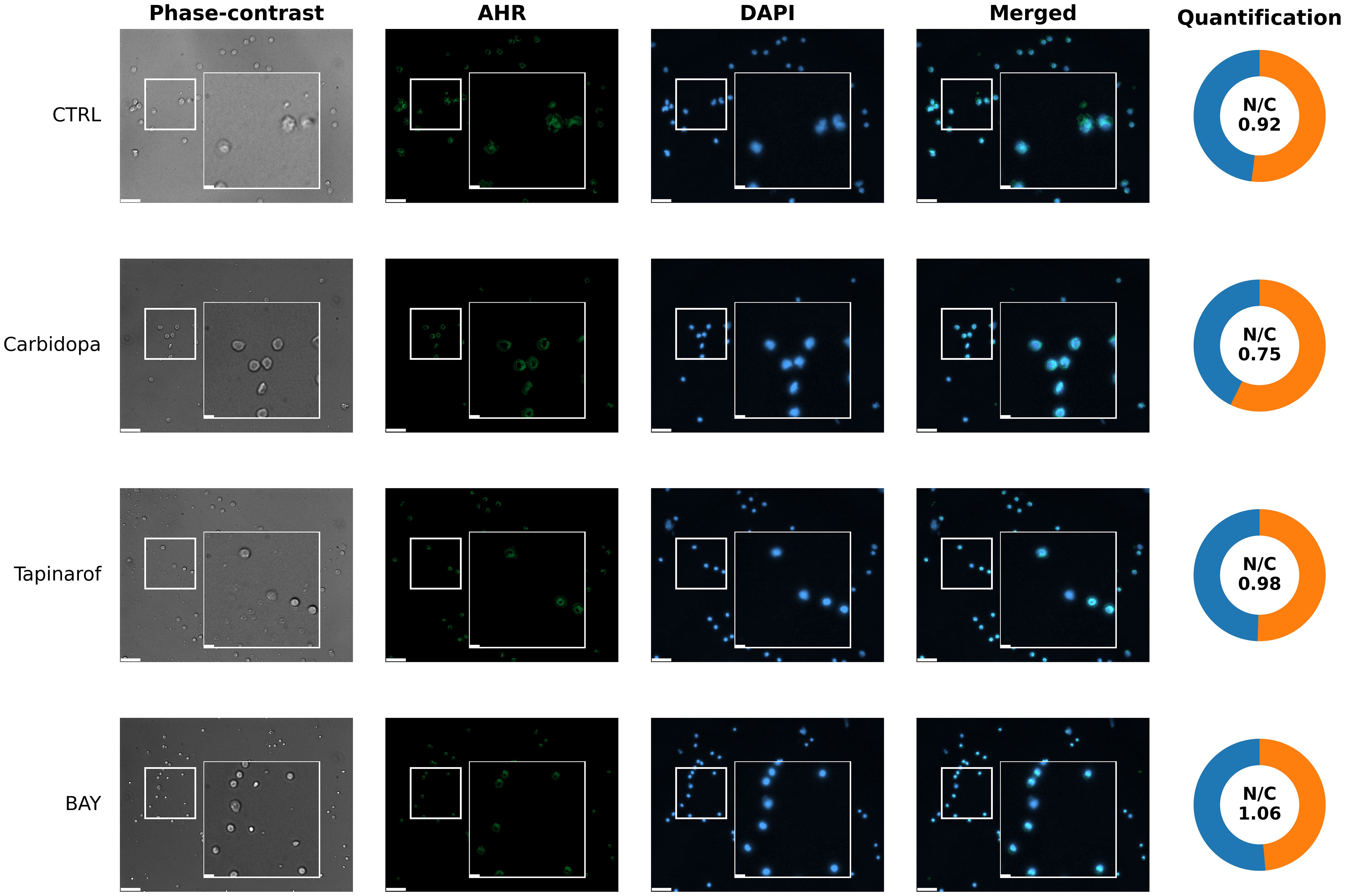 Figure 7. Representative images of aryl hydrocarbon receptor localization (immunocytochemistry) in primary blood cells from patient 256 (High/Medium AHR expression group). Cells were left untreated without modulators (CTRL) or treated with Carbidopa, BAY, or Tapinarof for 24 hours. AHR was visualized using immunofluorescence (green), and nuclei were counterstained with DAPI (blue). Each row corresponds to one treatment condition and displays individual channels (Phase-contrast, AHR, DAPI), merged images, and AHR nuclear/cytoplasmic (N/C) quantification. White squares indicate 3× magnified areas. Scale bar: 50 μm, zoom-in: 10 μm. Representative images are shown for one PDAC donor (patient 256) from the High/Medium AHR group; two biological replicates per group were analyzed in total. Quantitative analysis of both patients is presented in Supplementary Figure SF5A.