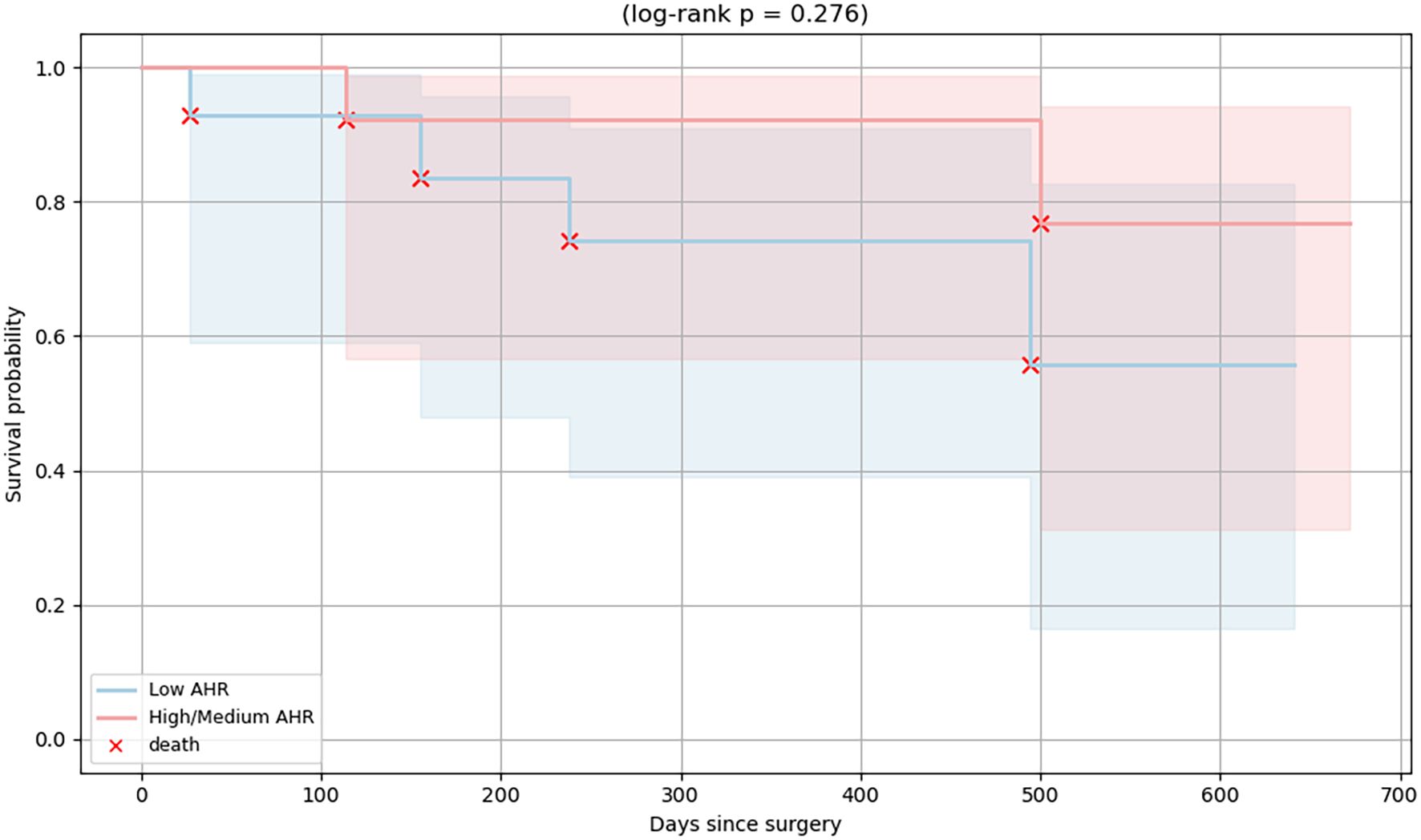 Figure 9. Kaplan–Meier survival curves of PDAC patients stratified by baseline AHR expression. Patients were grouped into High/Medium (red line) and Low (blue line) AHR expression groups. Each red “×” symbol indicates a death event. A non-significant difference in overall survival was observed between the groups (log-rank p = 0.276).