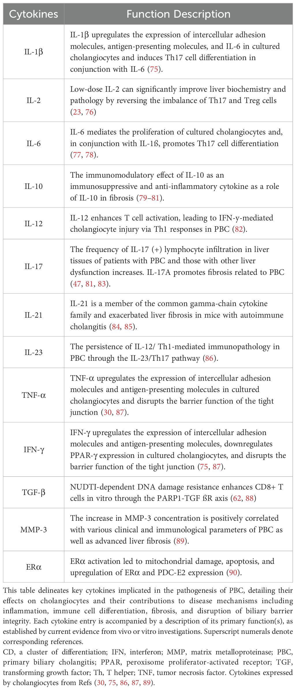 Inflammatory factors—ranging from molecular signaling pathways like TGF-β1/Smad and IRF3 phosphorylation, to immune cell subsets such as ILCs, and systemic cytokines—play crucial roles in the innate immune response of the biliary tract in PBC. These factors contribute to inflammation, tissue injury, and fibrosis, shaping the disease course and offering potential targets for therapeutic intervention.