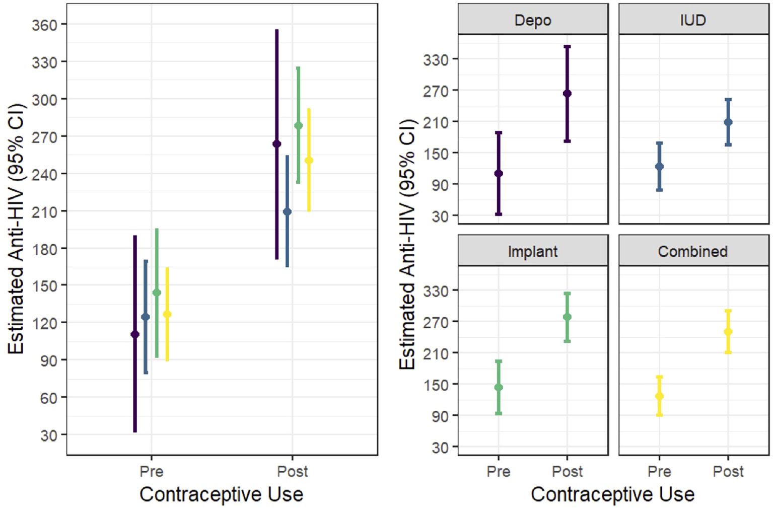 Overall, we found no substantial evidence of a change in immune cell populations that would alter HIV risk after initiation of three commonly-used progestin-based contraceptive methods: DMPA, ENG-implant, and LNG-IUD across all three contraceptive methods. However, there was an increase in the ability of genital tract secretions (CVL) to enhance HIV infection in vitro after HC initiation, which was consistent across the three HC modalities. The immune cell findings align with those of the ECHO trial, in which over 7,000 women were randomized to either DMPA, copper IUD, or LNG-implant (13). HIV incidence in that study was 4.9 per 100 woman-years in the DMPA group versus 3.9 and 3.3 in the copper IUD and LNG-implant groups, respectively, and there were no pairwise group differences. Our finding of baseline differences in sociodemographic variables and immune makers between women electing DMPA versus ENG-implant or LNG-IUD contraceptive methods underscores the potential for confounding to influence an observed relationship between contraceptive method and HIV acquisition, which could explain results from meta-analyses of observational studies. Our findings complement the epidemiologic evidence generated from ECHO and reassurance that the choice of contraceptive type does not pose additional HIV infection risk to users.