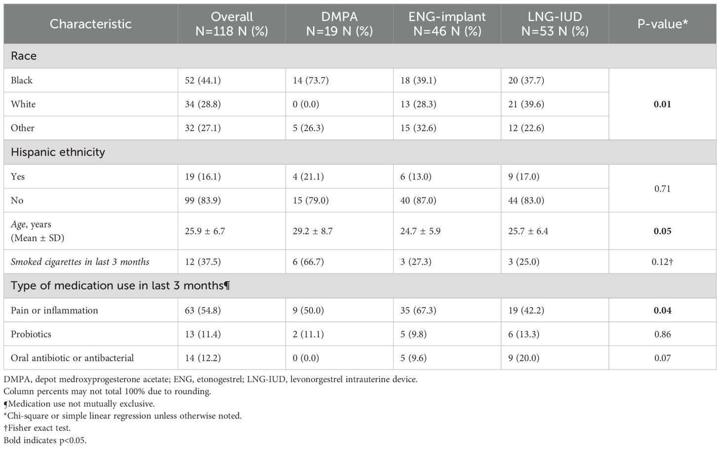 Overall, 118 participants were eligible for inclusion, provided informed consent, and enrolled in the study. The mean age of participants was 25.9 years (standard deviation 6.7 years). Fifty-two women (44.1%) self-identified as Black race and 19 (16.1%) as being of Hispanic ethnicity. Sixty-three participants (54.8%) reported using medication for pain or inflammation in the three months prior to study enrollment. No participant reported use of injectable steroids or chemotherapy. Fewer than 8 individuals (6.8%) reported use of any of the following: acid reducing medication, oral steroids, oral antifungals, acyclovir/valacyclovir, and/or antifungal cream. Scarcity precluded further consideration for analyses. For contraception, 19 participants (16.1%) selected DMPA, 46 (39.0%) selected ENG-implant, and 53 (44.9%) selected LNG-IUD. Women in the DMPA group were older (p<0.05) and more likely to self-report Black race (p=0.01). Those in the ENG-implant group were more likely to use pain medication (p=0.04), Table 1.