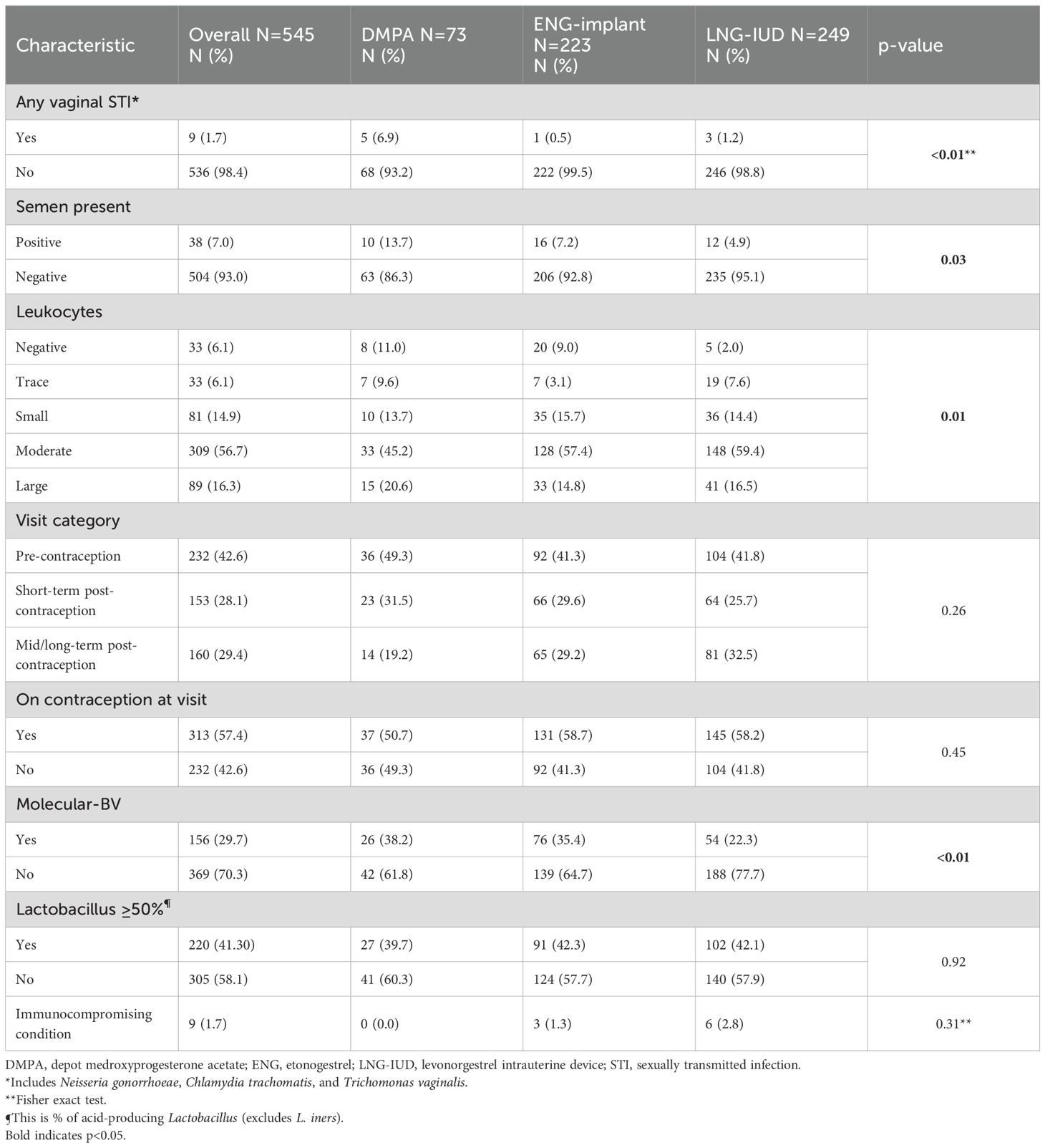 We conducted 545 total study visits with 313 (57.4%) occurring after contraception initiation. An STI (N. gonorrhoeae, C. trachomatis, or T. vaginalis) was diagnosed at 9 visits (1.7%). Moderate or large amounts of leukocytes were detected in CVL at 398 visits (73.0%). DMPA visits had higher rates of an STI diagnosis and presence of semen. The pattern of qualitative CVL leukocytes was differential across the contraceptive groups. Participants that selected the DMPA and ENG-implant had higher rates of molecular-BV relative to the participants that selected the LNG-IUD. Additional visit characteristics are listed in Table 2.