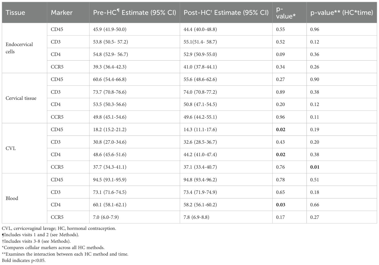 After longitudinal data visualization (Supplementary Figures S2-S13) and statistical assessment of cellular markers by contraception group across time, the pre-HC visits (1 and 2) and post-HC visits (2–8) were modeled jointly. Results from random effects linear mixed regression models with HC, time, and the interaction of the two are presented in Table 3. There were no differences in proportion of CD45+ leukocytes, CD3+ T cells, CD4+ T cells, or CCR5+ CD4+ T cells in the endocervix or cervical tissue biopsy from pre-contraception to post-contraception initiation. In blood, there was a small decrease in the proportion of CD4+ T cells after initiation of HC, but no difference in CCR5+ CD4+ T cells or the other cellular proportions. In the CVL compartment, the proportion of CD45+ cells and CD4+ T cells decreased modestly post-contraception, but CCR5+ CD4+ T cells were unchanged (p=0.76). There was a significant interaction (p<0.01) between HC and time observed in CVL for CCR5+ CD4+ T cells, which was explored in separate linear mixed regression models for each tissue type that included HC method (DMPA, ENG-implant, LNG-IUD), time (pre/post HC), and the interaction of method and time (Supplementary Table S1). The CCR5+ stratum-specific cellular proportion for each contraceptive method before and after HC revealed no difference in CCR5+ CD4+ T cells between pre-HC and post-HC for DMPA or ENG-implant for any tissue type (endocervix, cervical tissue, CVL, blood). There was a significant decrease in the proportion of CCR5+ CD4+ T cells in CVL among LNG-IUD users: pre-HC 40.6 (95% CI 36.1, 45.1) to post-HC 32.4 (95% CI 27.9, 36.9; p<0.01). See Supplementary Table S1.
