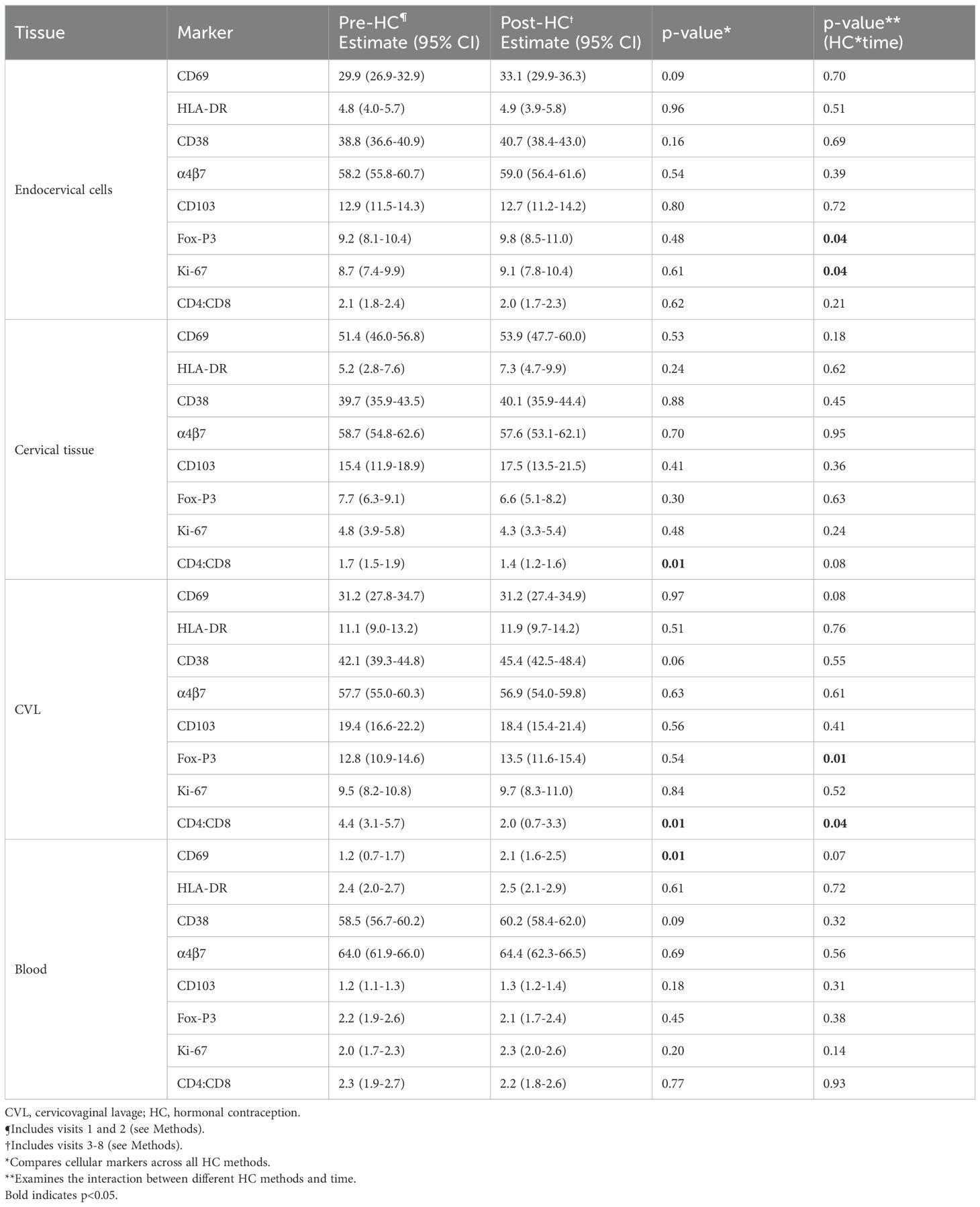 Secondary outcomes included cellular markers for T cell activation (HLA-DR, CD69, CD38), trafficking (CD103, α4β7), regulation (Fox-P3), proliferation (Ki-67), and tissue residency (CD69, CD103) and the ratio of CD4+ to CD8+ T cells. We estimated multivariable linear mixed effects regression models with the outcome of cellular marker and the independent variables HC, time, and the interaction of HC and time (Table 4). There were no differences between pre-HC and post-HC in any of the four compartments (endocervix, cervical tissue, CVL, or blood) except for a small increase in the proportion of CD69+ cells in blood after HC initiation (from 1.2 to 2.1, p=0.01) and a decrease in the CD4:CD8 ratio in cervical tissue and CVL after HC initiation (p=0.01 for both).