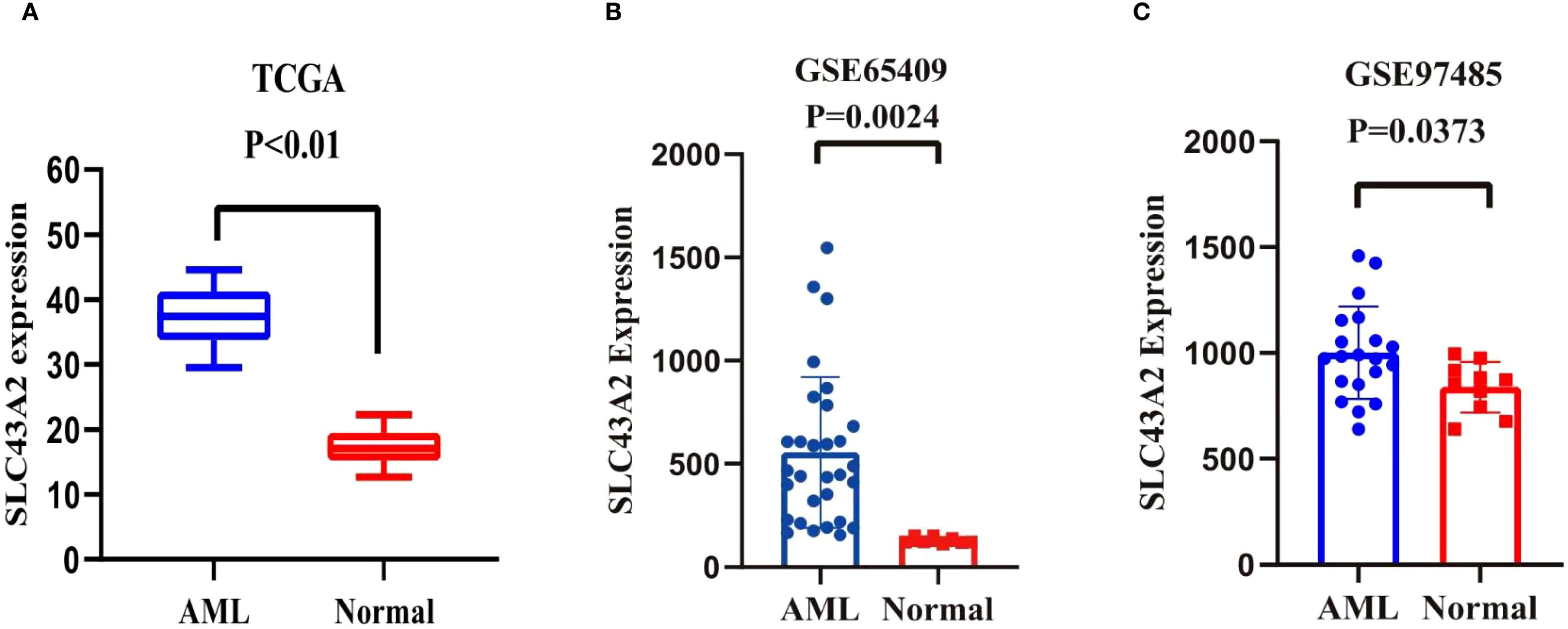 Figure 1. Differential expression of SLC43A2. (A-C) Data from TCGA datasets and two different GEO datasets showed that the expression level of SLC43A2 is significantly higher in AML compared to normal tissues (P < 0.05).