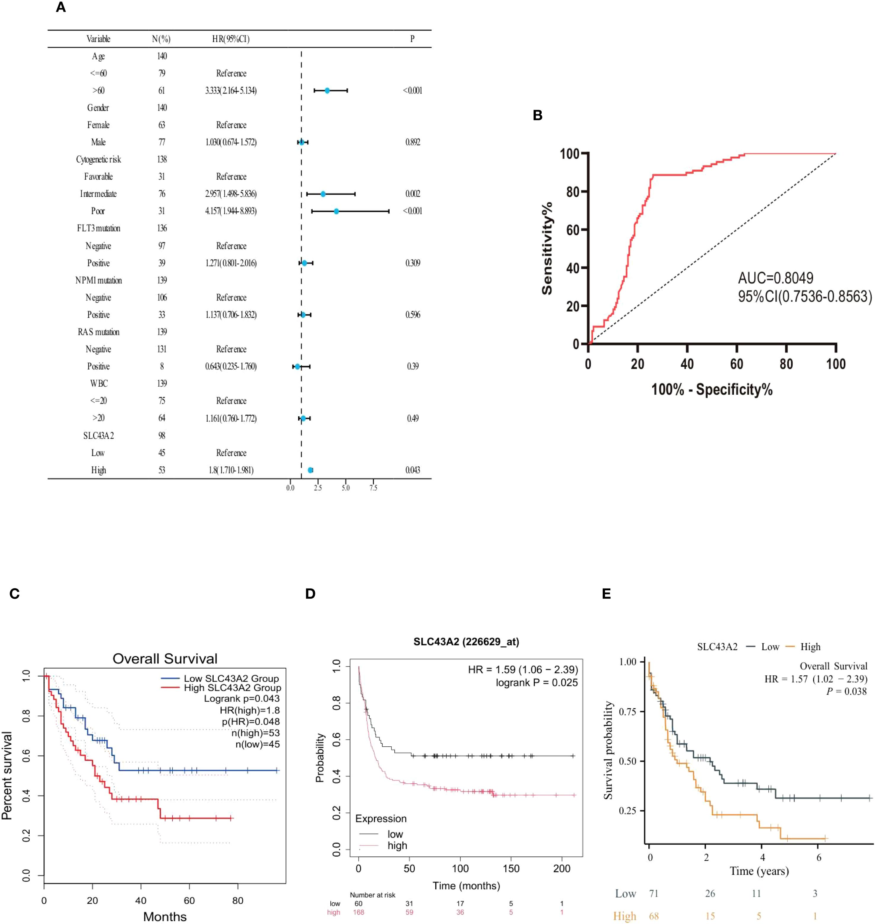 Figure 2. Prognostic value of SLC43A2 in AML. (A) Forest plot shows the results of univariate Cox regression analysis of SLC43A2 expression on overall survival (OS) in AML patients with different clinicopathological features. (B) ROC curve and AUC of SLC43A2 in the TCGA dataset. (C-E) Kaplan-Meier curves of OS in AML patients with high/low SLC43A2 expression.
