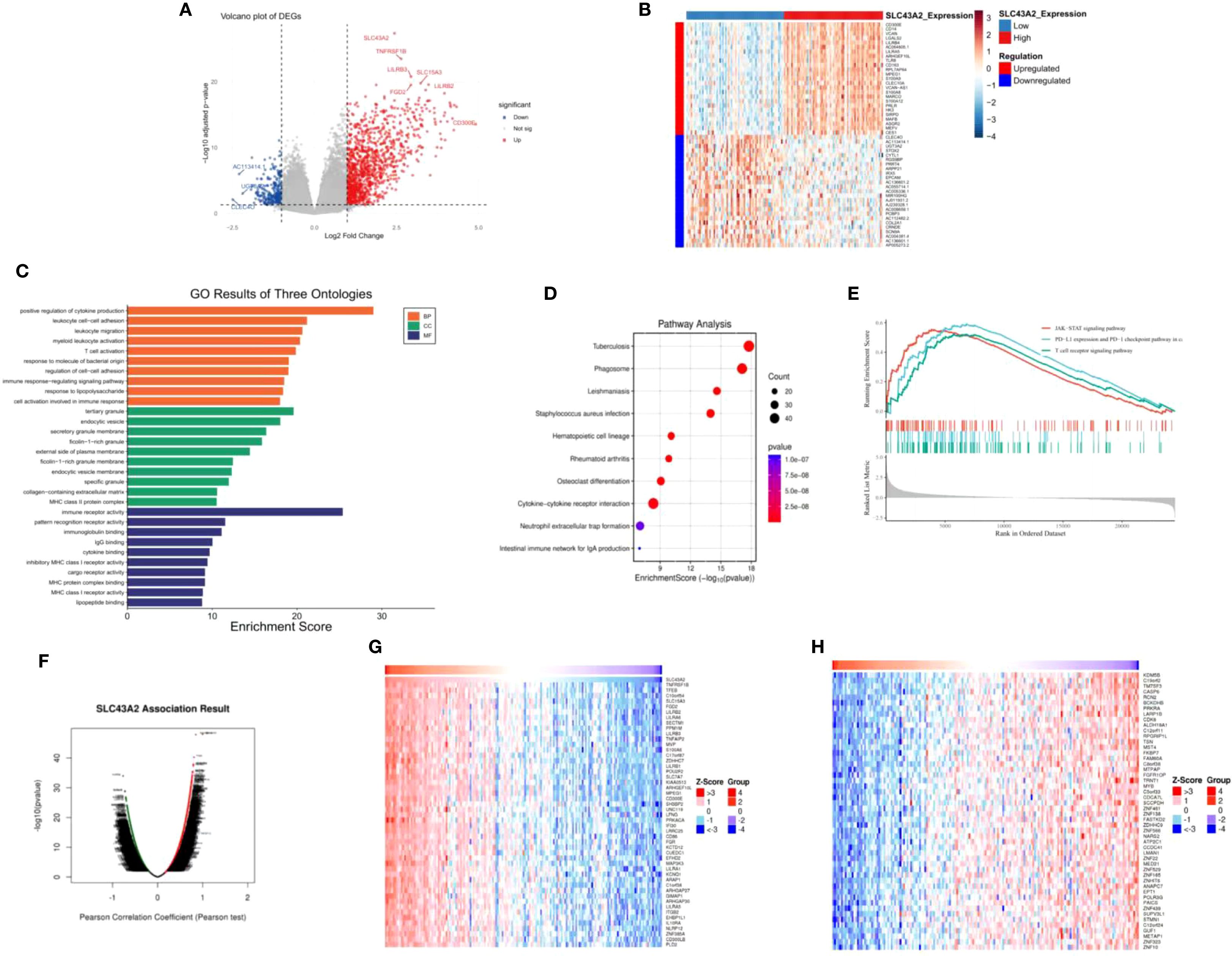 Figure 3. Potential mechanism of action of SLC43A2 in AML. (A) Volcano plot showing differential genes in AML patients with high or low SLC43A2 expression. (B) Heat map showing the top 20 differentially expressed genes. (C, D) GO and KEGG analysis of differentially expressed genes. (E) GSEA showed pathway enrichment in the SLC43A2 high and low expression groups. (F) Volcano plot showing all the related genes of SLC43A2. (G, H) Top 50 genes with positive/negative correlations with SLC43A2.