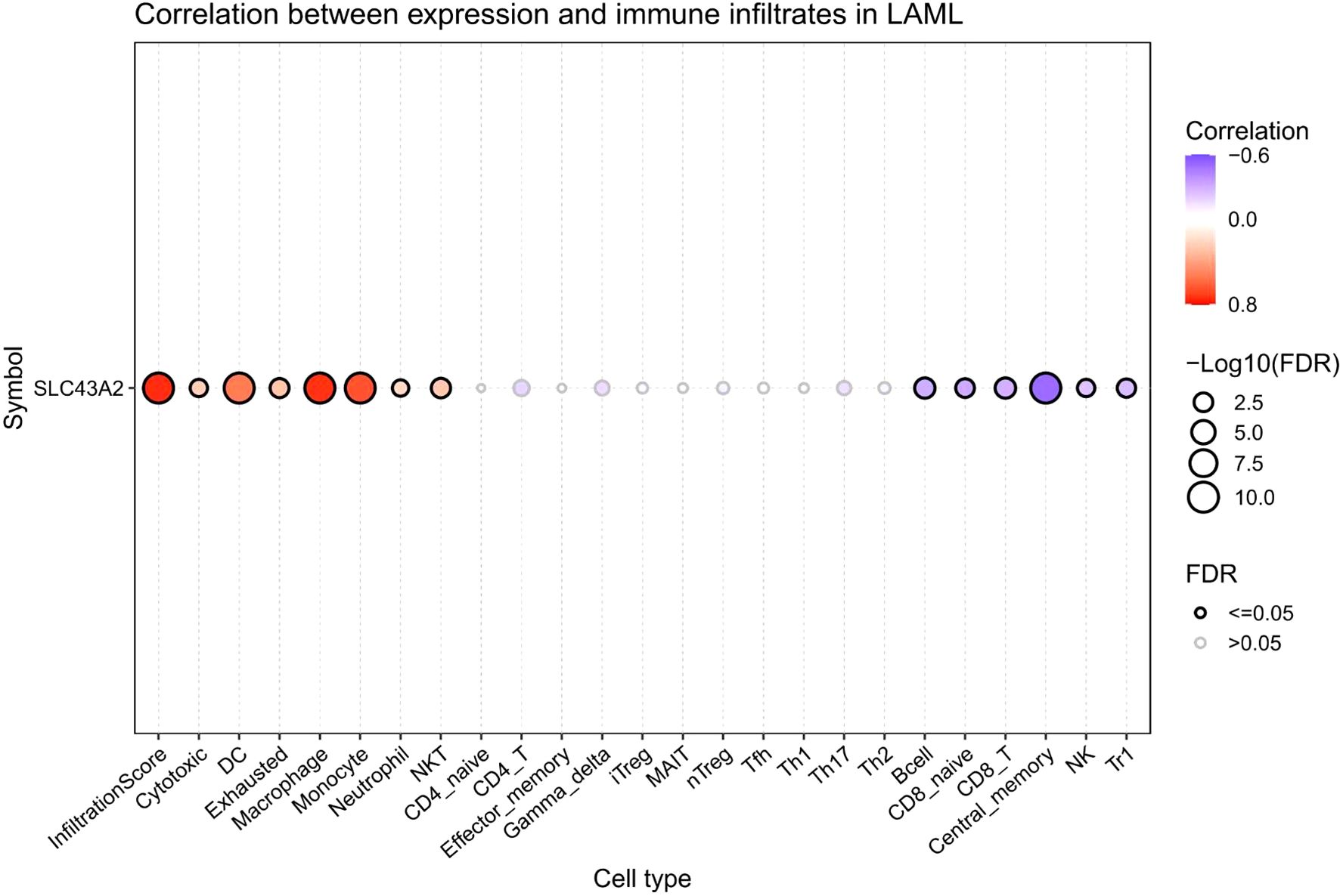 Background: Tumor cells compete with T cells for methionine by overexpressing SLC43A2 (solute carrier family 43 member 2), leading to T cell exhaustion. However, the correlation between SLC43A2 and immune infiltration or malignant features in acute myeloid leukemia (AML) has rarely been explored.