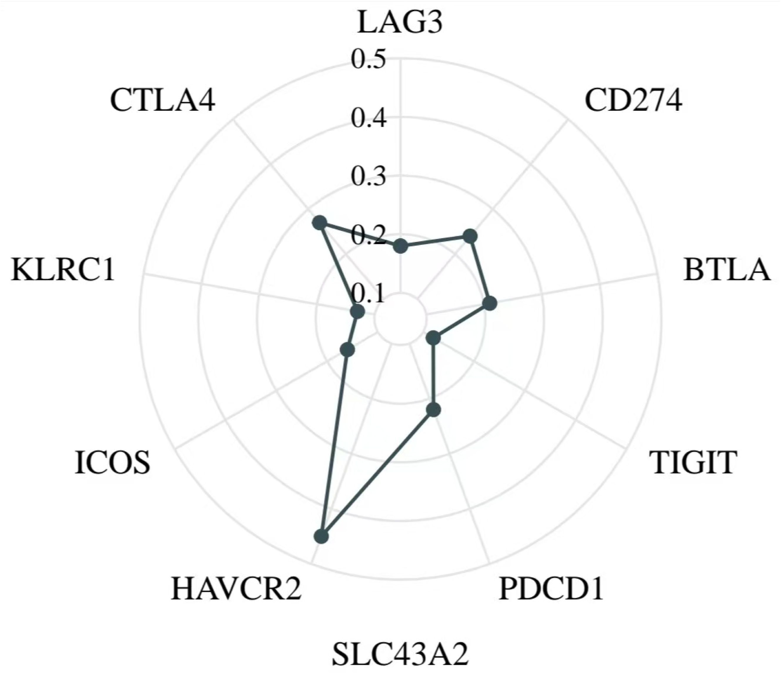 Figure 5. Relationship between SLC43A2 expression and immune checkpoints. SLC43A2 expression was significantly positively correlated with BTLA (r = 0.21), CTLA4 (r = 0.27), CD274 (r = 0.24), LAG3 (r = 0.18), TIGIT (r = 0.12), KLRC1 (r = 0.13), ICOS (r = 0.16), and HAVCR2 (r = 0.45).