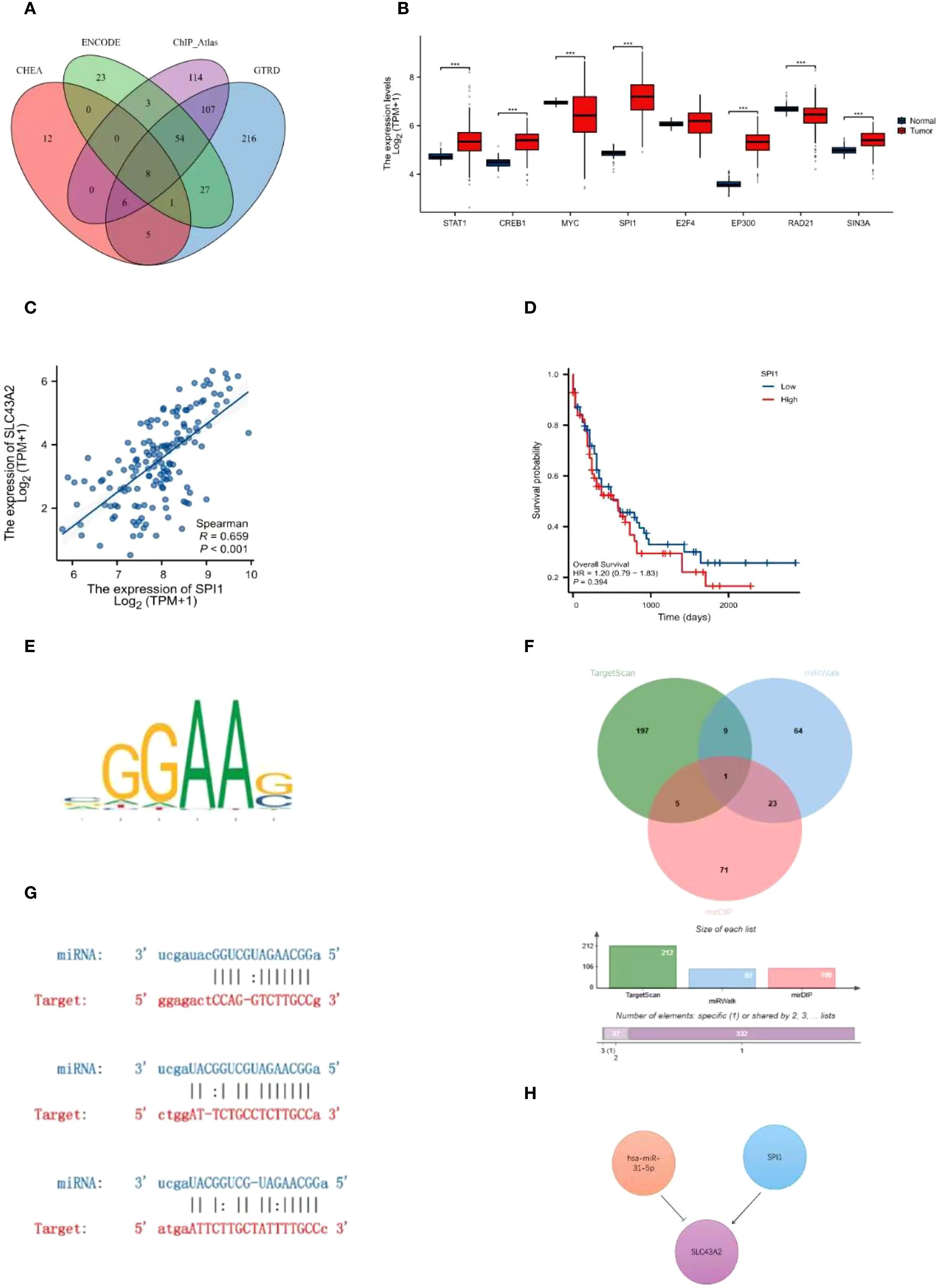 Figure 6. Construction of the upstream regulatory network of SLC43A2. (A) Venn diagram analysis identified STAT1, CREB1, MYC, SPI1, E2F4, EP300, RAD21 and SIN3A as potential TFS of SLC43A2. (B) Expression levels of STAT1, CREB1, MYC, SPI1, E2F4, EP300, RAD21 and SIN3A in TCGA-LAML dataset. (C) Scatter plot of the association between SPI1 and SLC43A2. (D) Comparison of OS between SPI1 high and low expression groups. (E) Predicted transcription factor binding motifs. (F) Venn diagram analysis identified hsa-miR-31-5p as a potential miRNA of SLC43A2. (G) Predicted interaction between SLC43A2 and hsa-miR-31-5p. (H) Potential upstream TF-miRNA-mRNA regulatory network of SLC43A2. ***P<0.001.