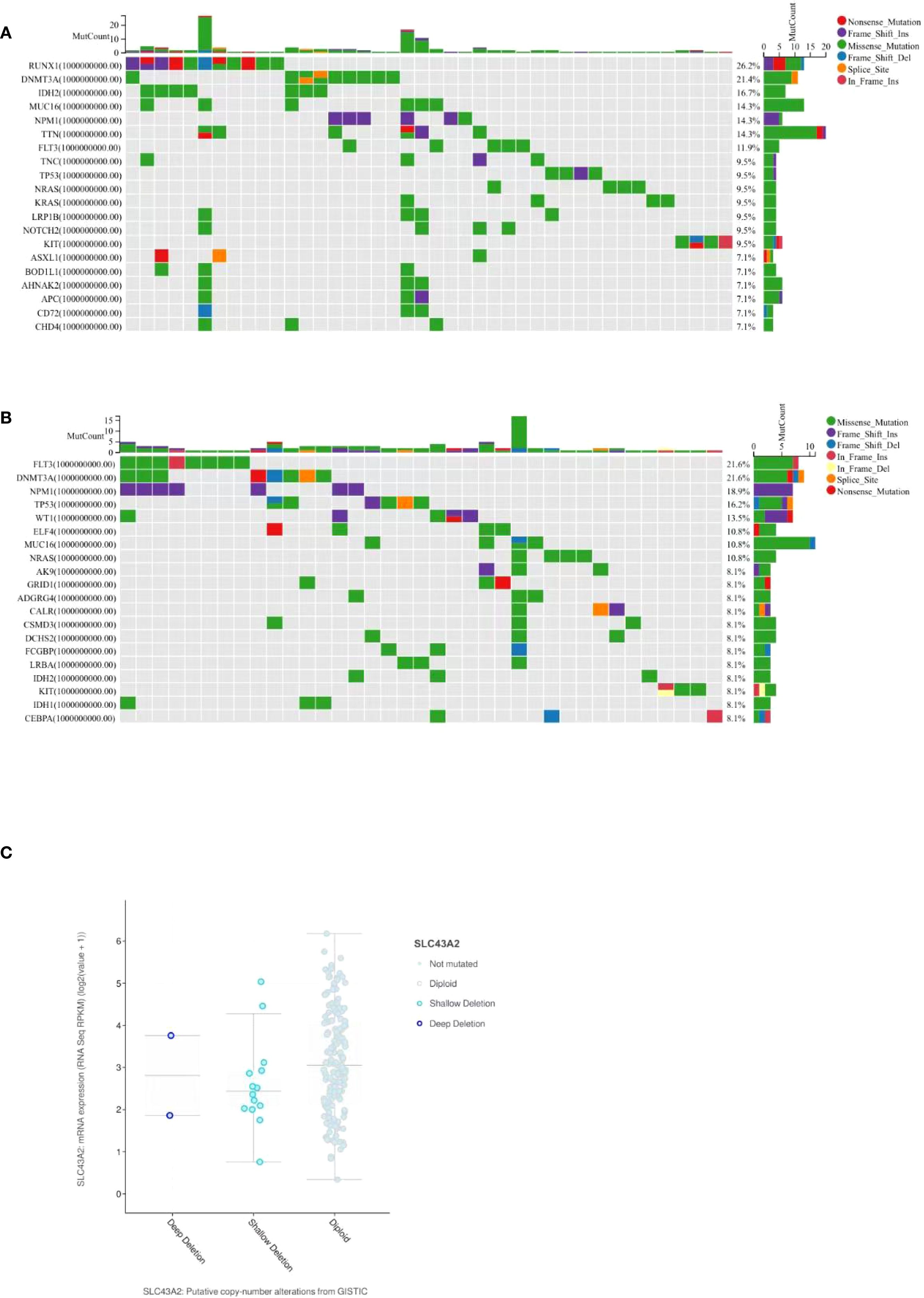 Figure 7. Mutational analysis of SLC43A2 related genes. (A) Top 20 significantly different somatic mutations in the SLC43A2 high expression group. (B) Top 20 significantly different somatic mutations in the SLC43A2 low expression group. (C) cBioPortal analysis based on TCGA-LAML data showed that deletion, diploidy, copy number gain and amplification were involved in the dysregulation of SLC43A2 expression.