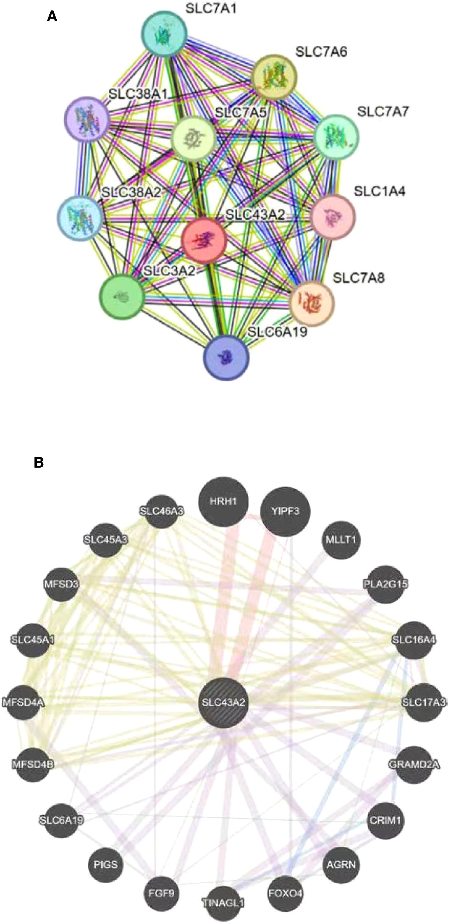 Figure 8. Gene and protein network of SLC43A2. (A) Network diagram of interactions between proteins encoded by the SLC43A2 gene. (B) Analysis of SLC43A2-related gene networks by GeneMANIA database.