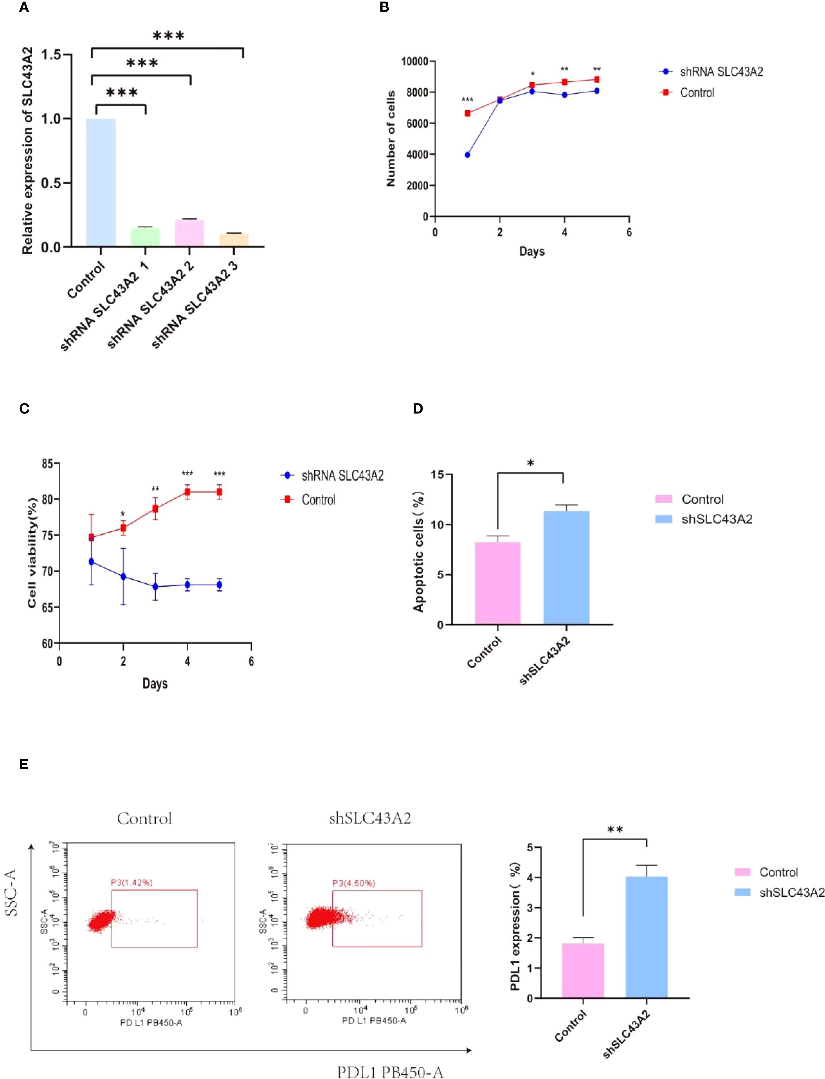 Figure 9. Verify the effect of SLC43A2 on tumor cells through in vitro experiments. (A) The knockdown efficiency of shRNA was verified by PCR. (B, C) The number and activity of U937 between the two groups were measured by flow cytometry. (D, E) Flow cytometry analysis showed that relatively high SLC43A2 expression promoted U937 apoptosis as well as PD-L1 expression. *P<0.05;**P<0.01;***P<0.001.
